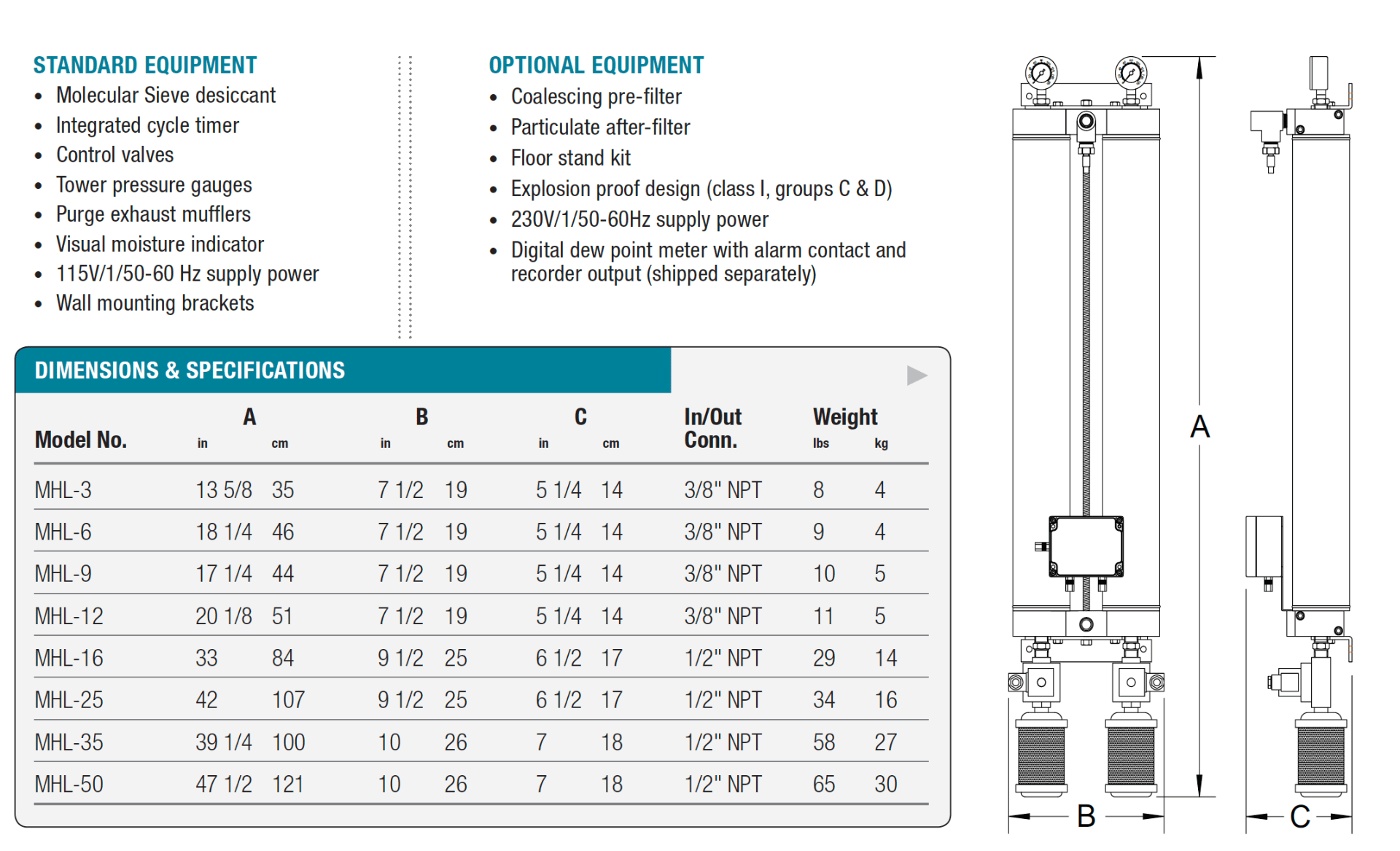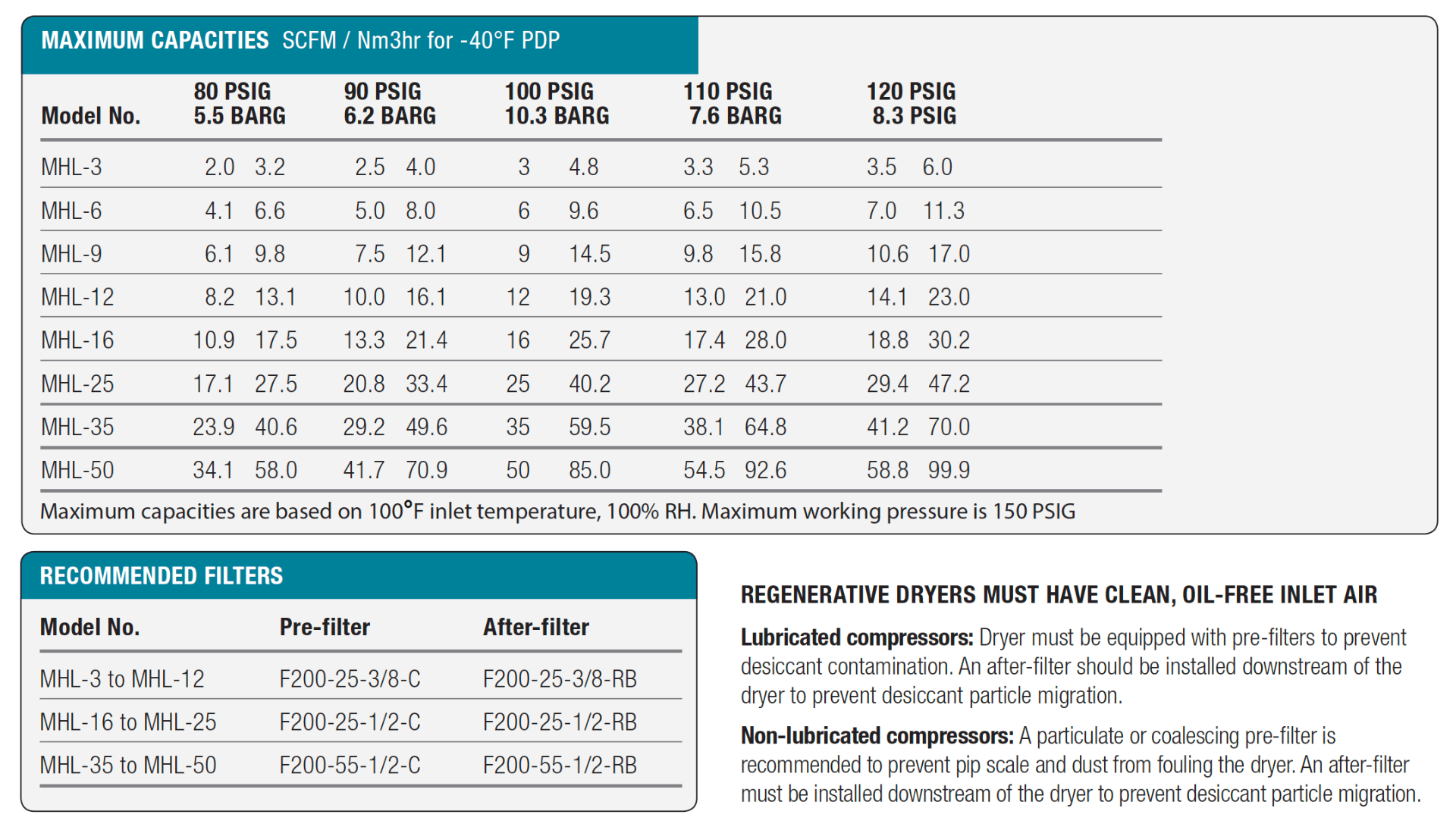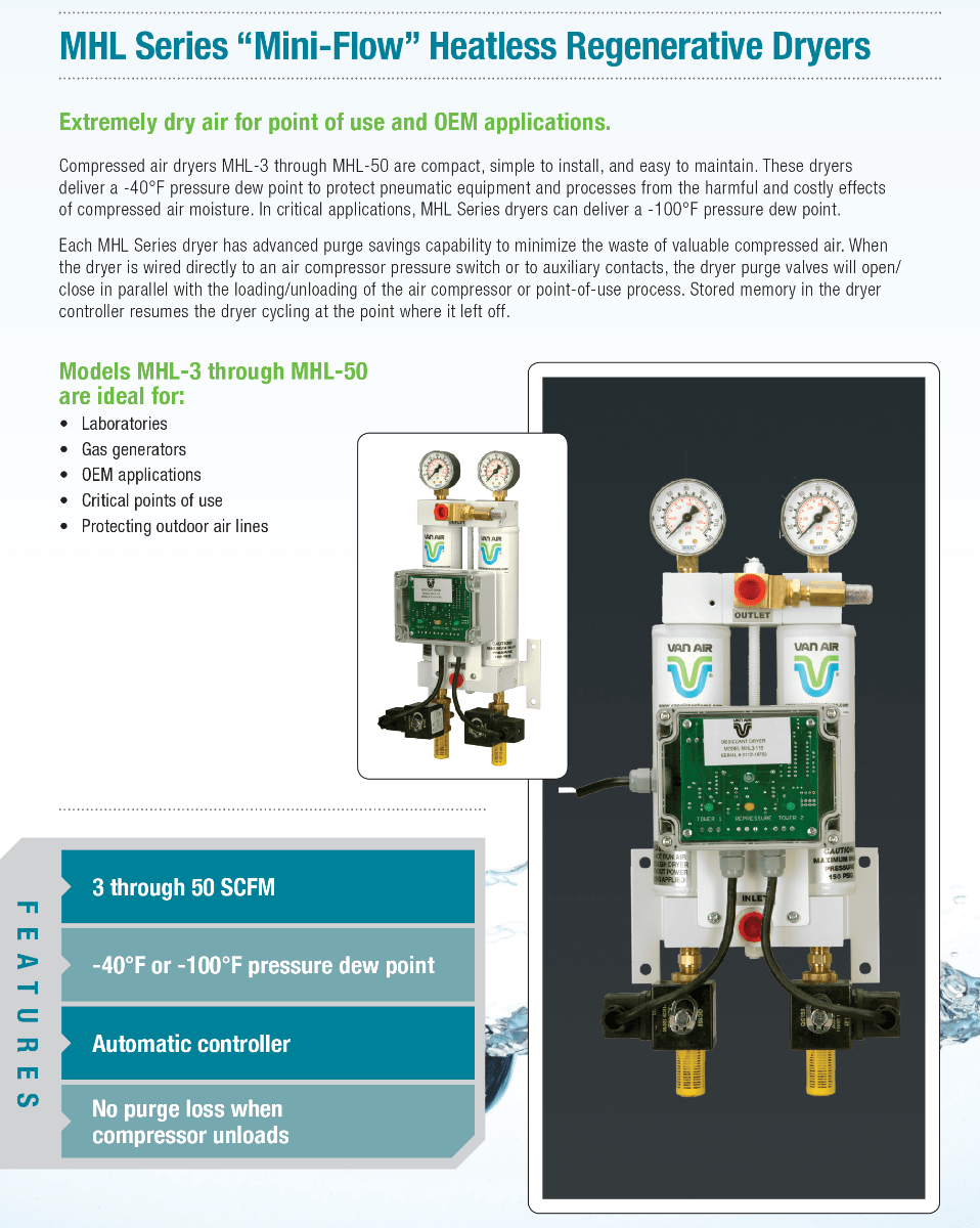When treating small volumes of compressed air, an MHL series heatless regenerative desiccant compressed air dryer delivers dew points down to -100°F. Clean and dry compressed air keeps the most vital pneumatic equipment and processes operating smoothly and efficiently