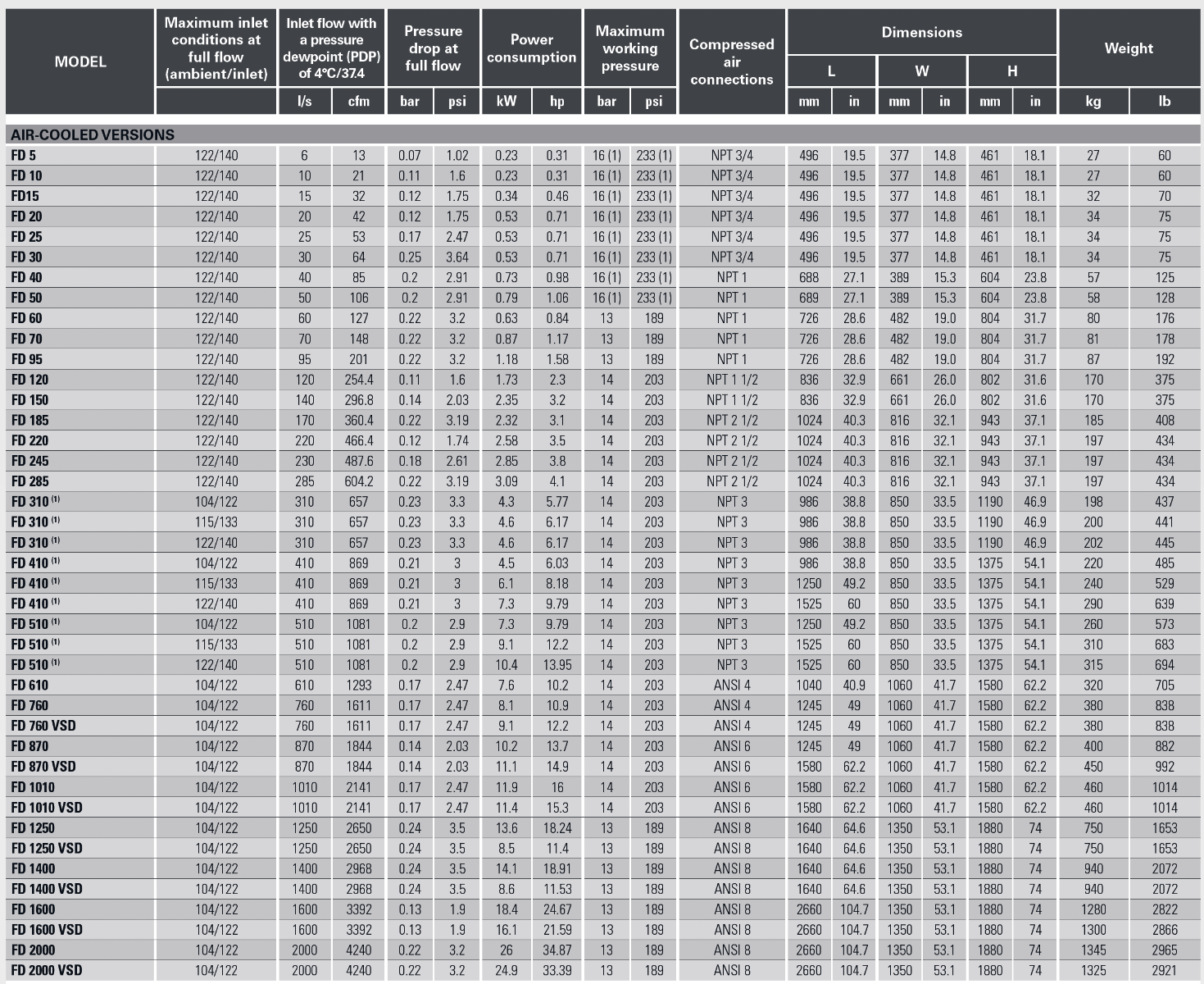 Based on direct expansion technology, our high quality FD refrigerated air dryers remove moisture from compressed air with a stable dew point as low as +3°C/+37.4°F. Water- and air-cooled versions are available