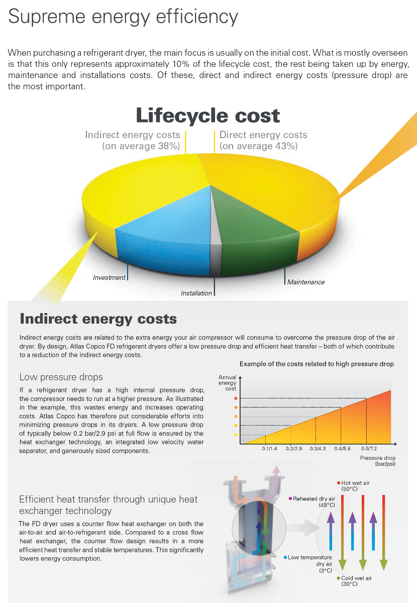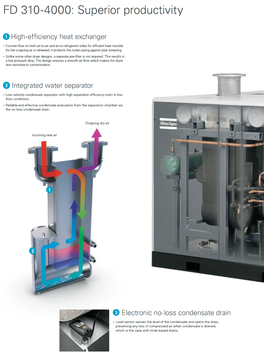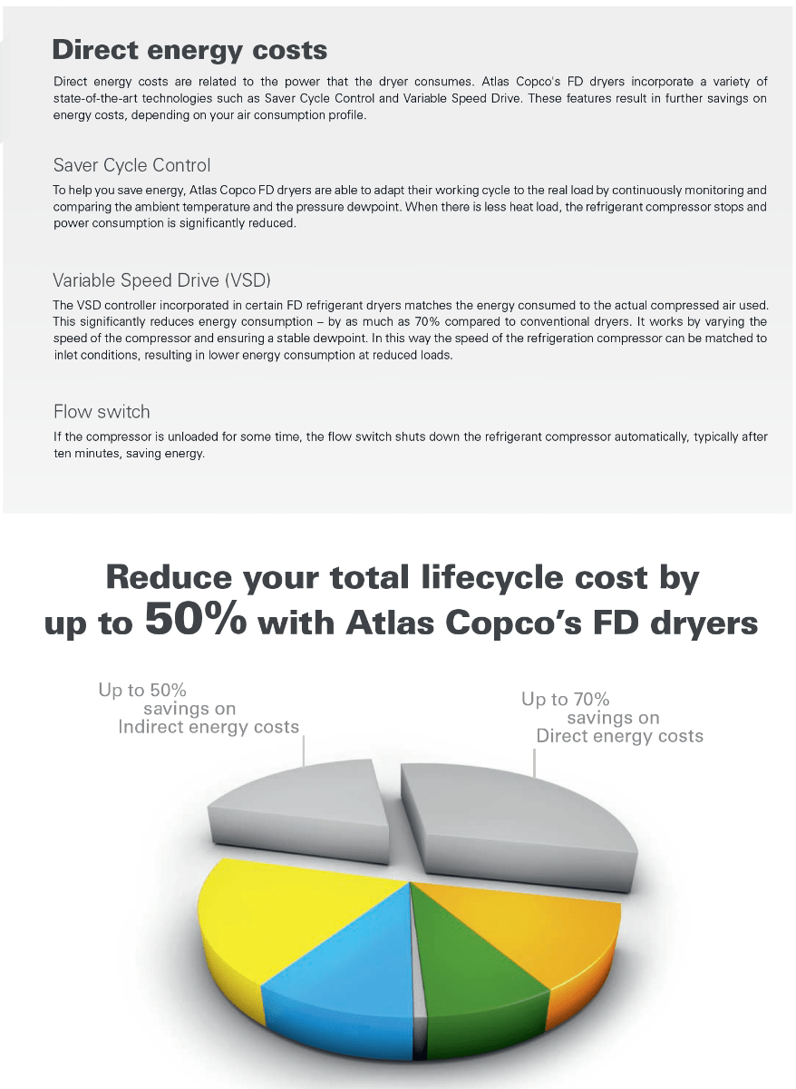 FD compressed air dryers incorporate advanced energy saving features and low pressure drops to reduce total power consumption.