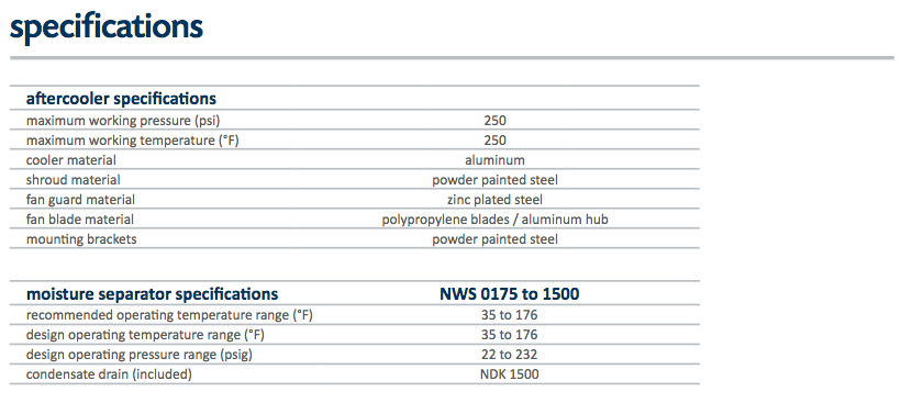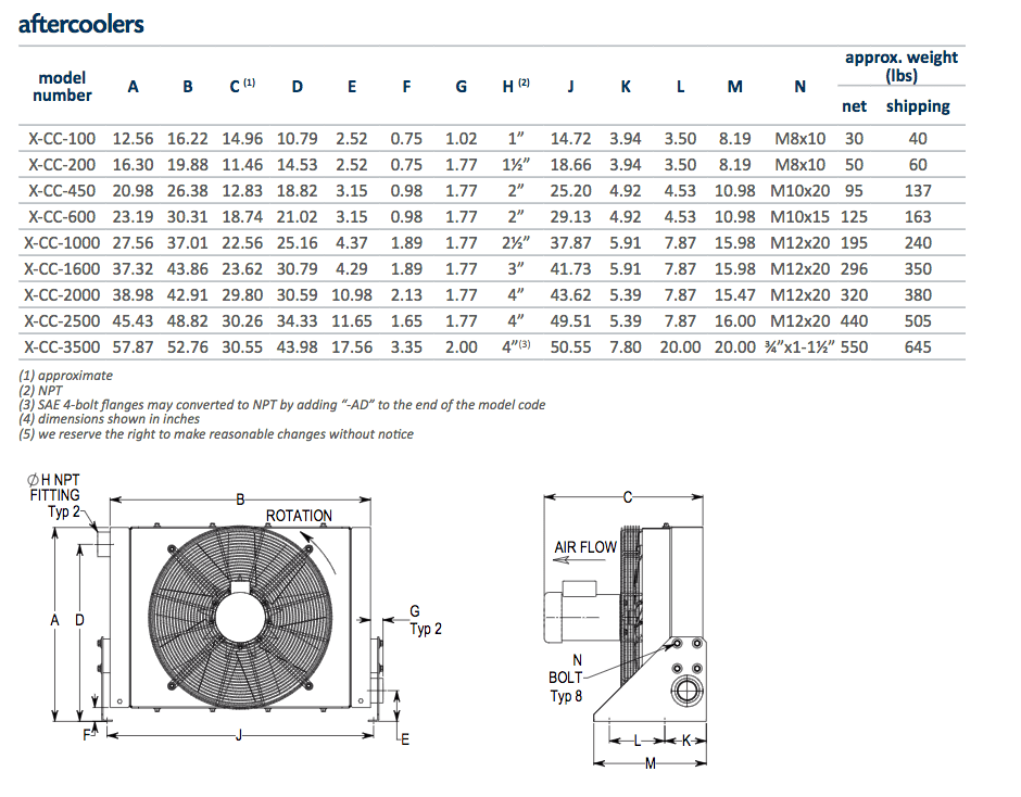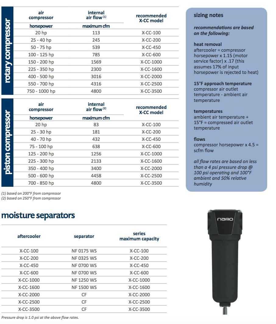 PERFORMANCE, X-CC series is a complete after-cooler package designed to work on most models of rotary and piston air compressors.  To select the appropriate model, simply determine compressor horsepower, and select the model from the chart.
