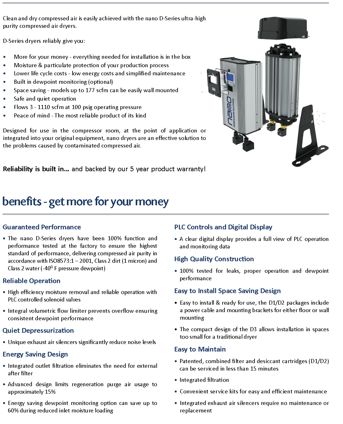 - Built in inlet water separator (D1 only) eliminates the cost and pressure drop of installing a separate inlet filter in small oil-free compressor applications*