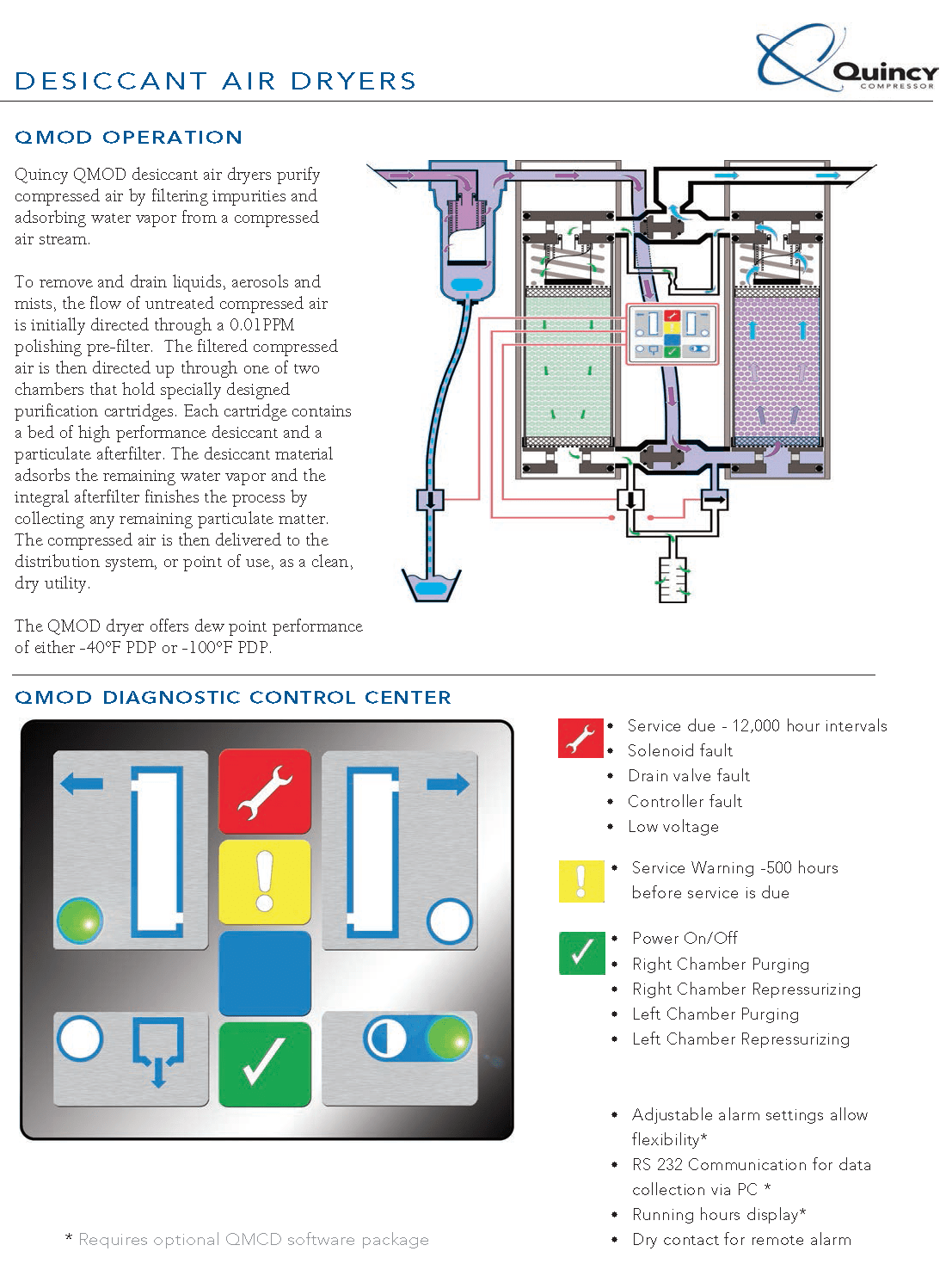 The QMOD is a state of the art modular heatless desiccant dryer engineered for optimum space and performance. From 8cfm up to 365cfm this dryer delivers a -40 degree F instrument quality or -100 degree F process air for system demands. The diagnostic center ensures the dryer is maintained by tracking the service hours.