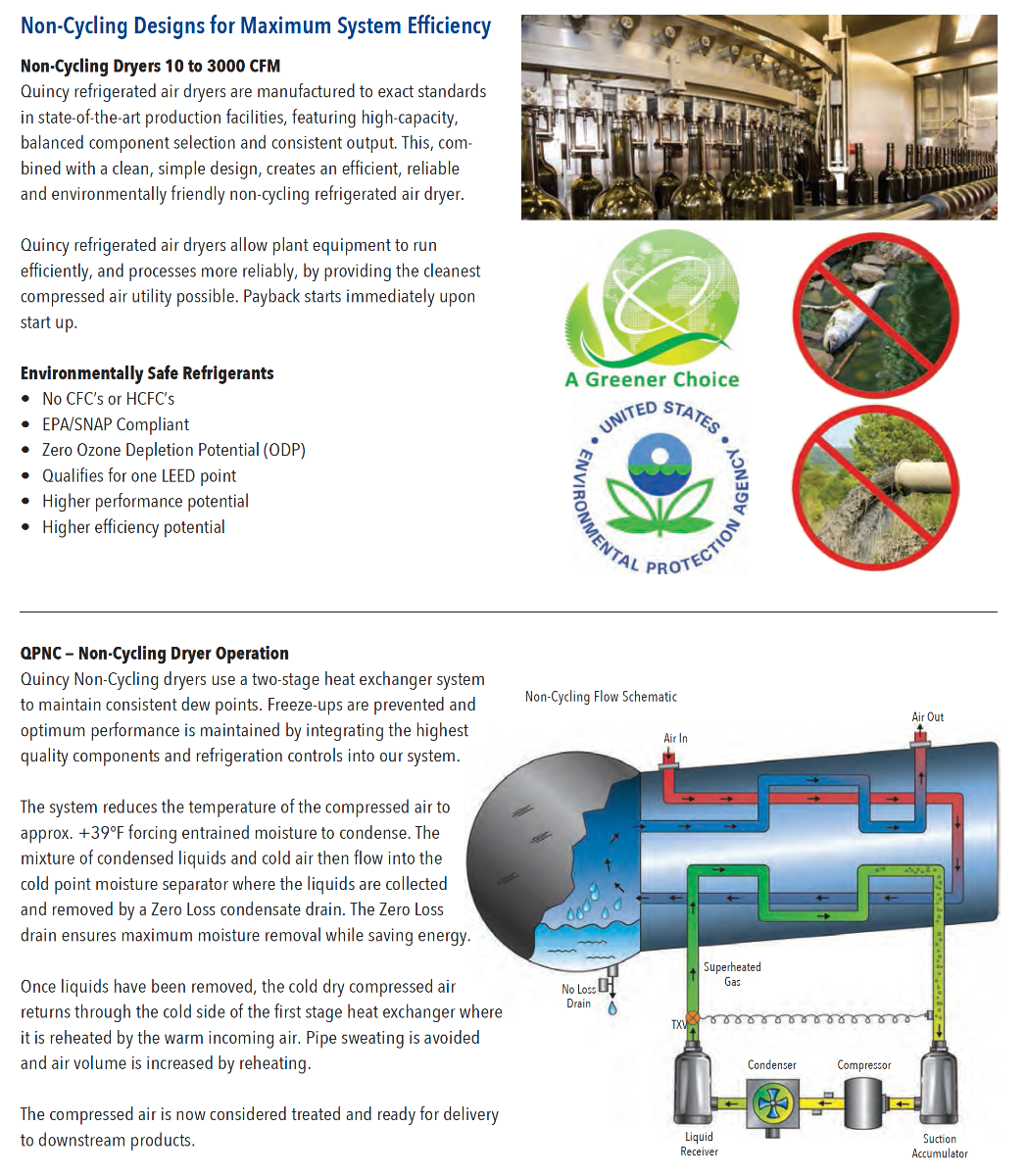 Quincy refrigerated air dryers are manufactured to exact standards in state-of-the-art production facilities, featuring high-capacity, balanced component selection and consistent output. This, com-bined with a clean, simple design, creates an efficient, reliable and environmentally friendly non-cycling refrigerated air dryer.