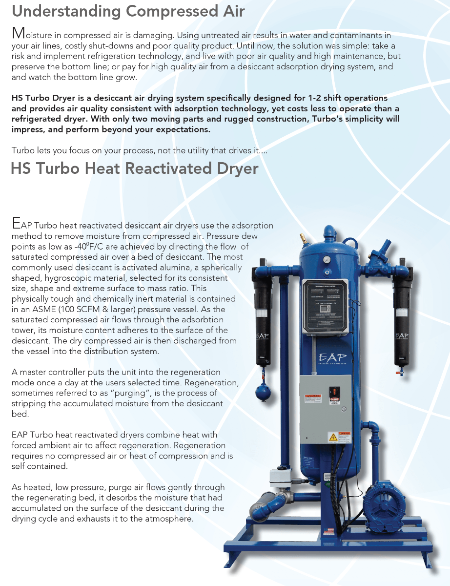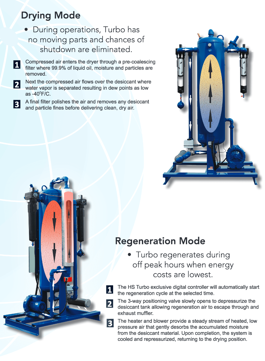 The HS Turbo Dryer is a desiccant air drying system specifically designed for 1-2 shift operations and provides air quality consistent with adsorption technology, yet costs less to operate than a refrigerated dryer. Offering pressure dew points as low as -40 F/C