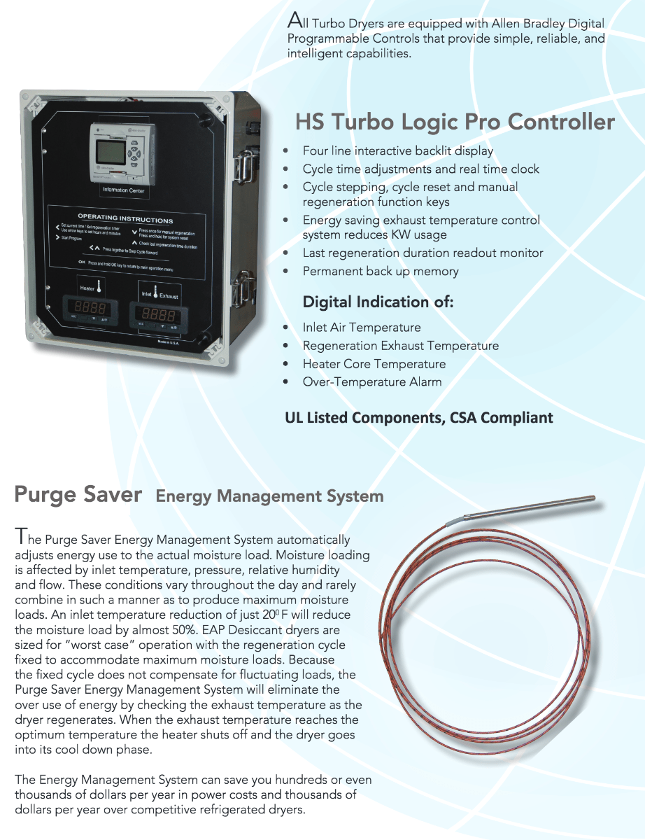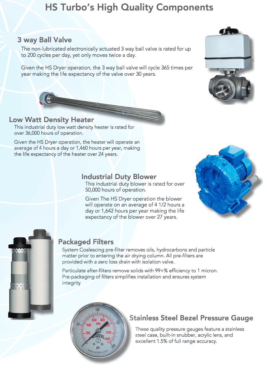 - Turbo dryers only switches once a day greatly reducing down time and component fatigue.