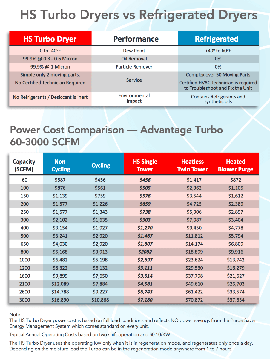 - Power, no dryer uses less power, including refrigeration. The Turbo is self regenerative and requires no compressed air during recharging.
