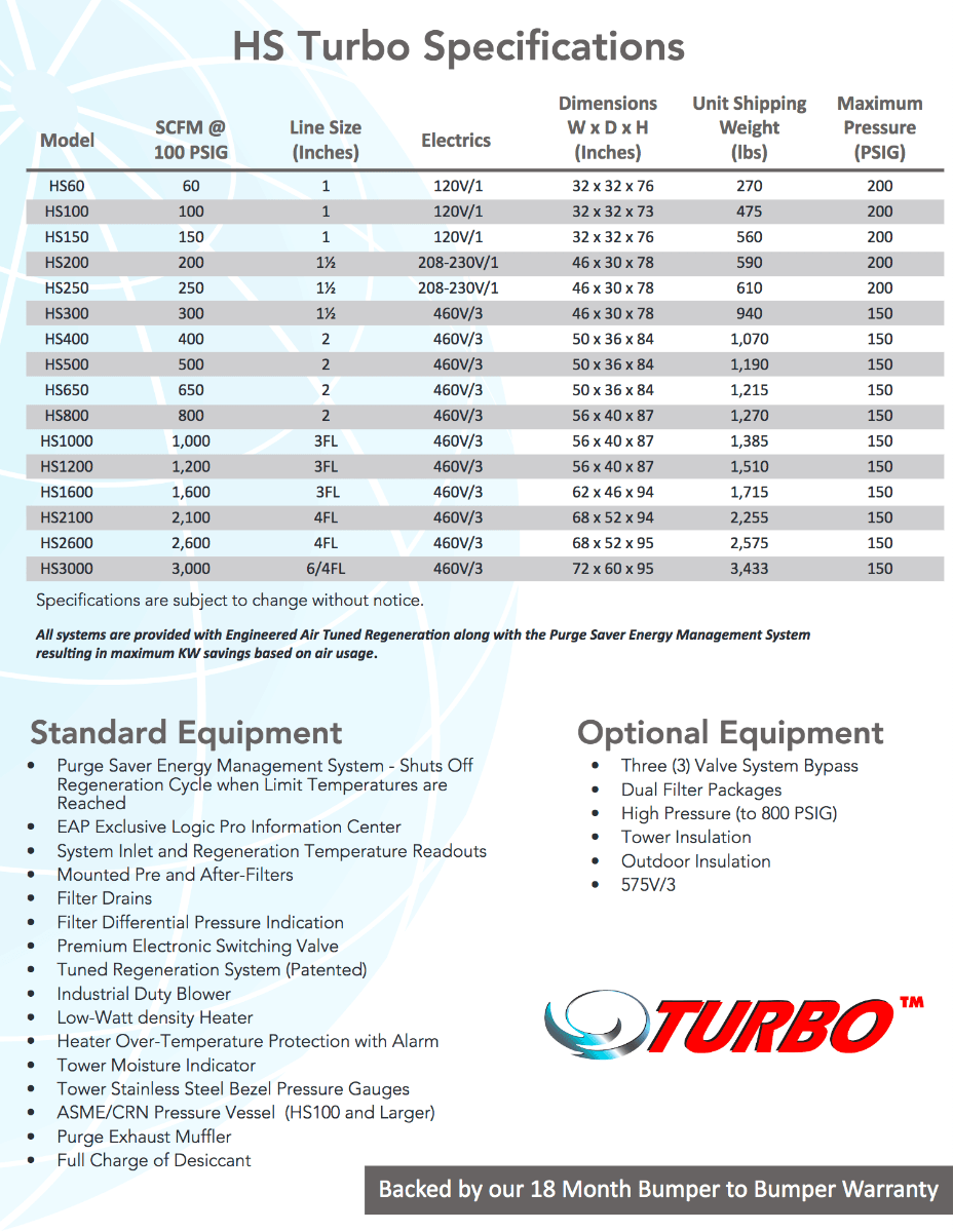 - Performance, Turbo delivers air three times as dry as traditional refrigeration systems. Service can be performed by maintenance personnel and does not require costly HVAC technicians.