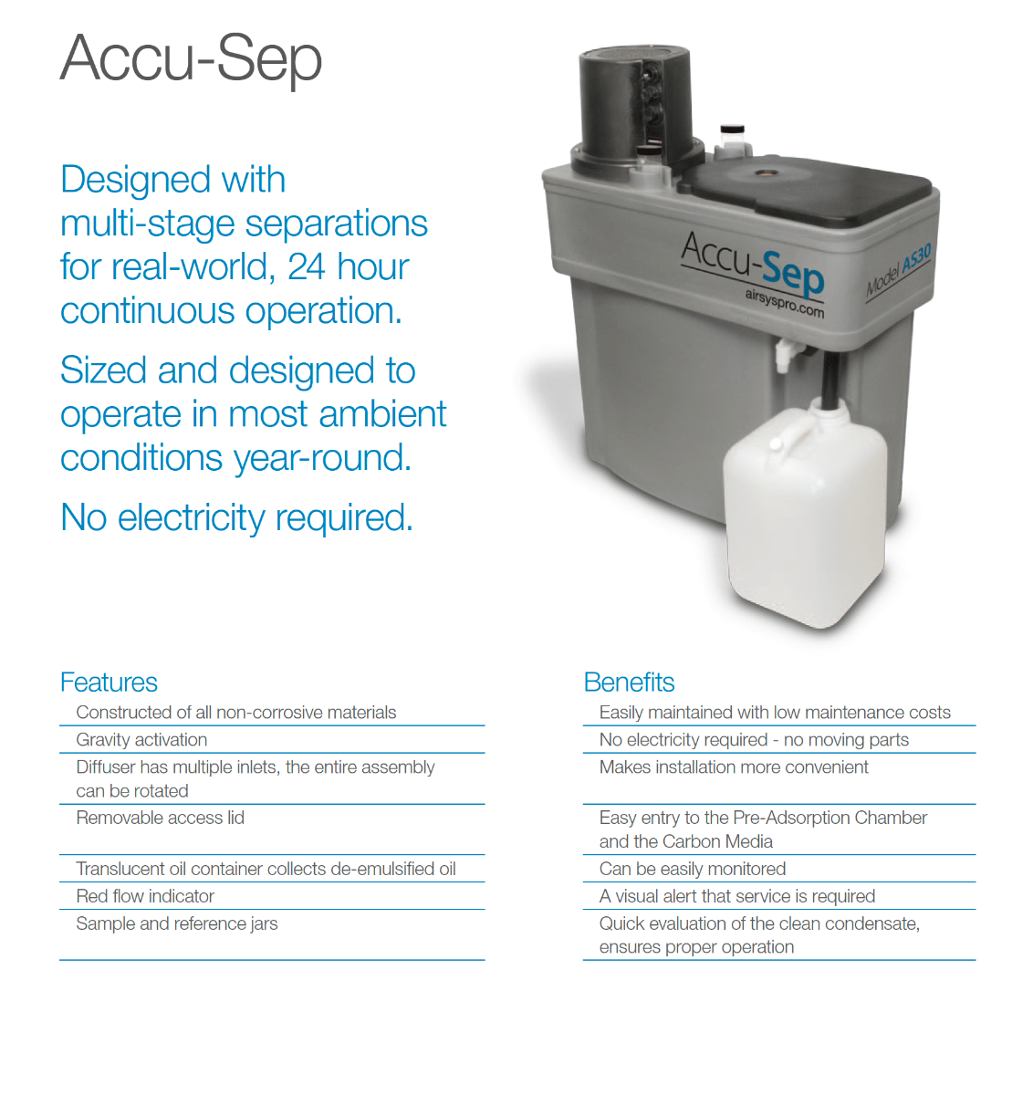 Designed with multi-stage separations for real-world, 24 hour continuous operation. Sized and designed to operate in most ambient conditions year-round. No electricity required.