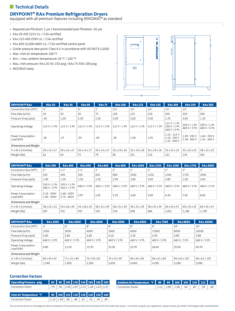 The air-cooled DRYPOINT® RA compressed air refrigeration dryers complement the BEKO TECHNOLOGIES dryer program with another cost effective alternative. The comprehensive RA model range of products allows optimum adaptation of the compressed air processing to individual operating conditions. All models excel in minimum pressure loss even with varying work loads and in their low energy consumption. The standard series comprises refrigeration dryers with performances up to 5000 scfm.