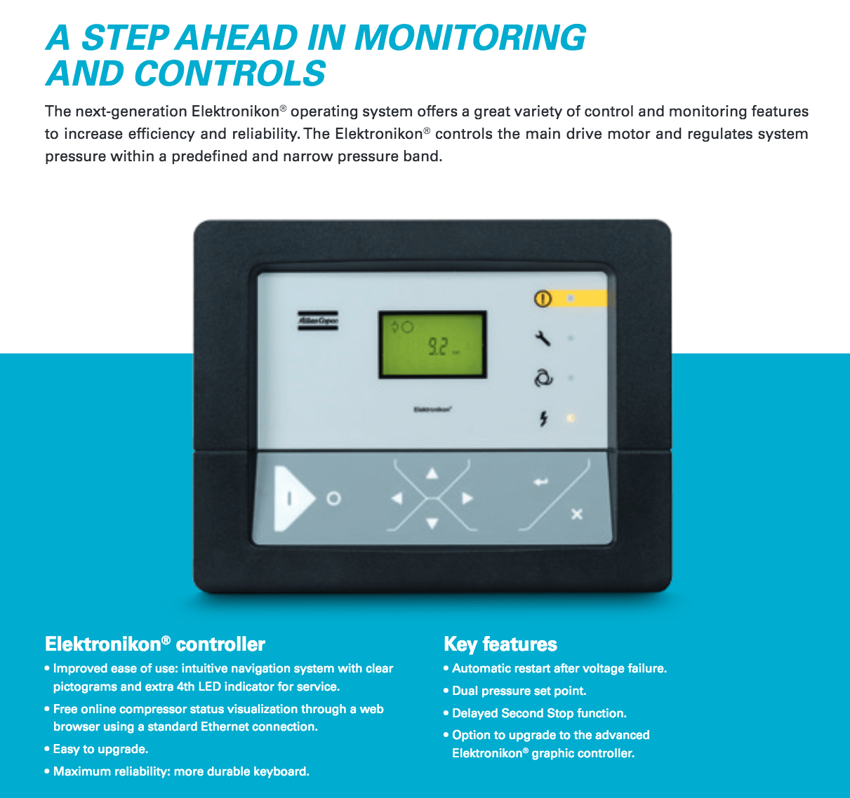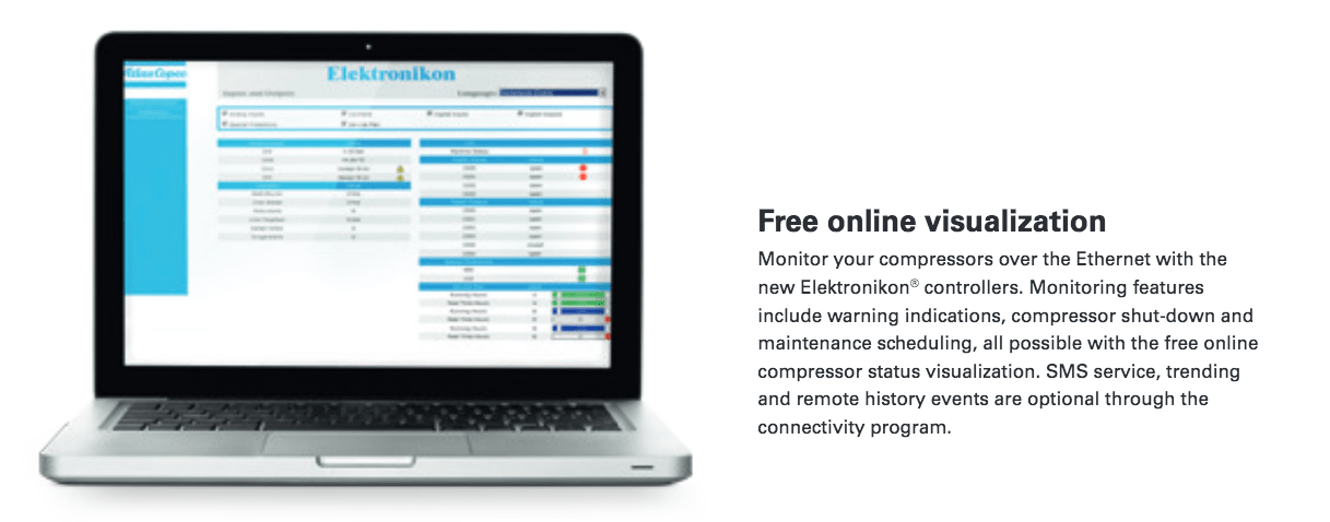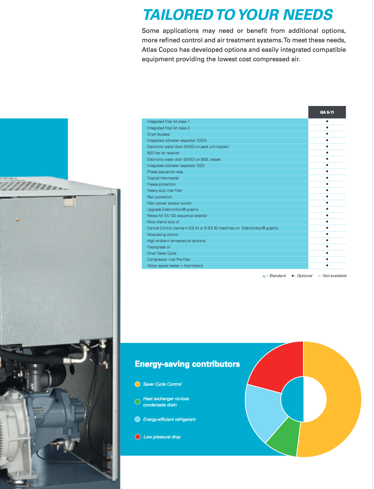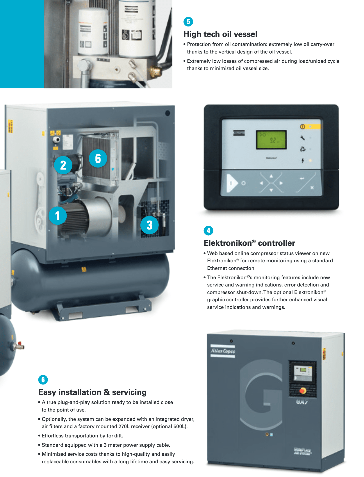 Atlas Copco GA Series - Single Stage, air-cooled and oil injected compressors. GA series compressors are available as Pack or Full Feature units.