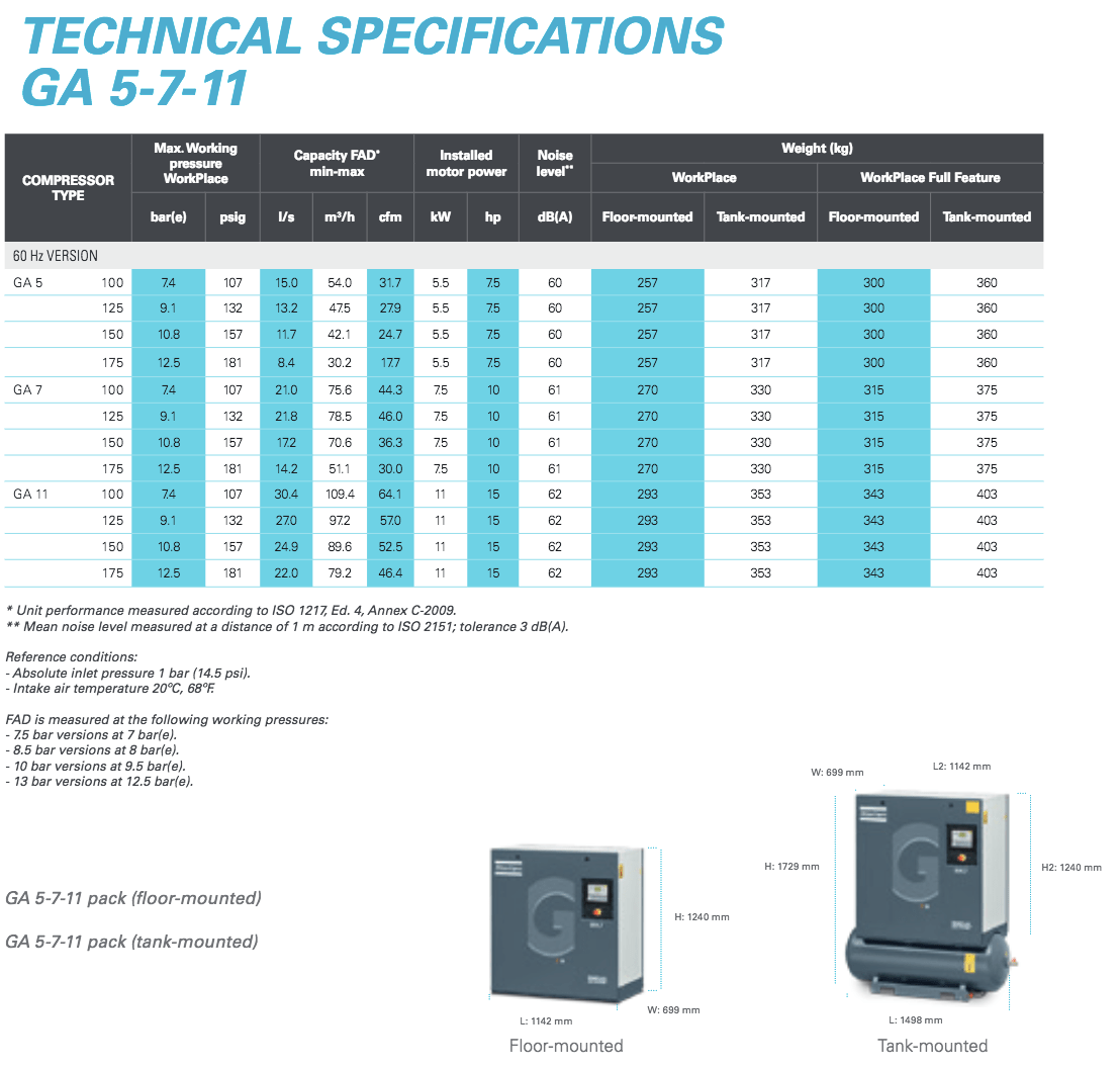 Atlas Copco 10 HP Rotary Screw Air Compressor with 71 Gallon Air Tank | 36.3 CFM @ 150 PSI | GA7-150T AP 208-230/460, 71 Gal | 8153003820