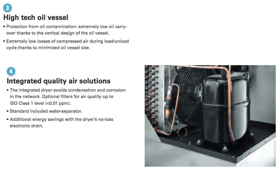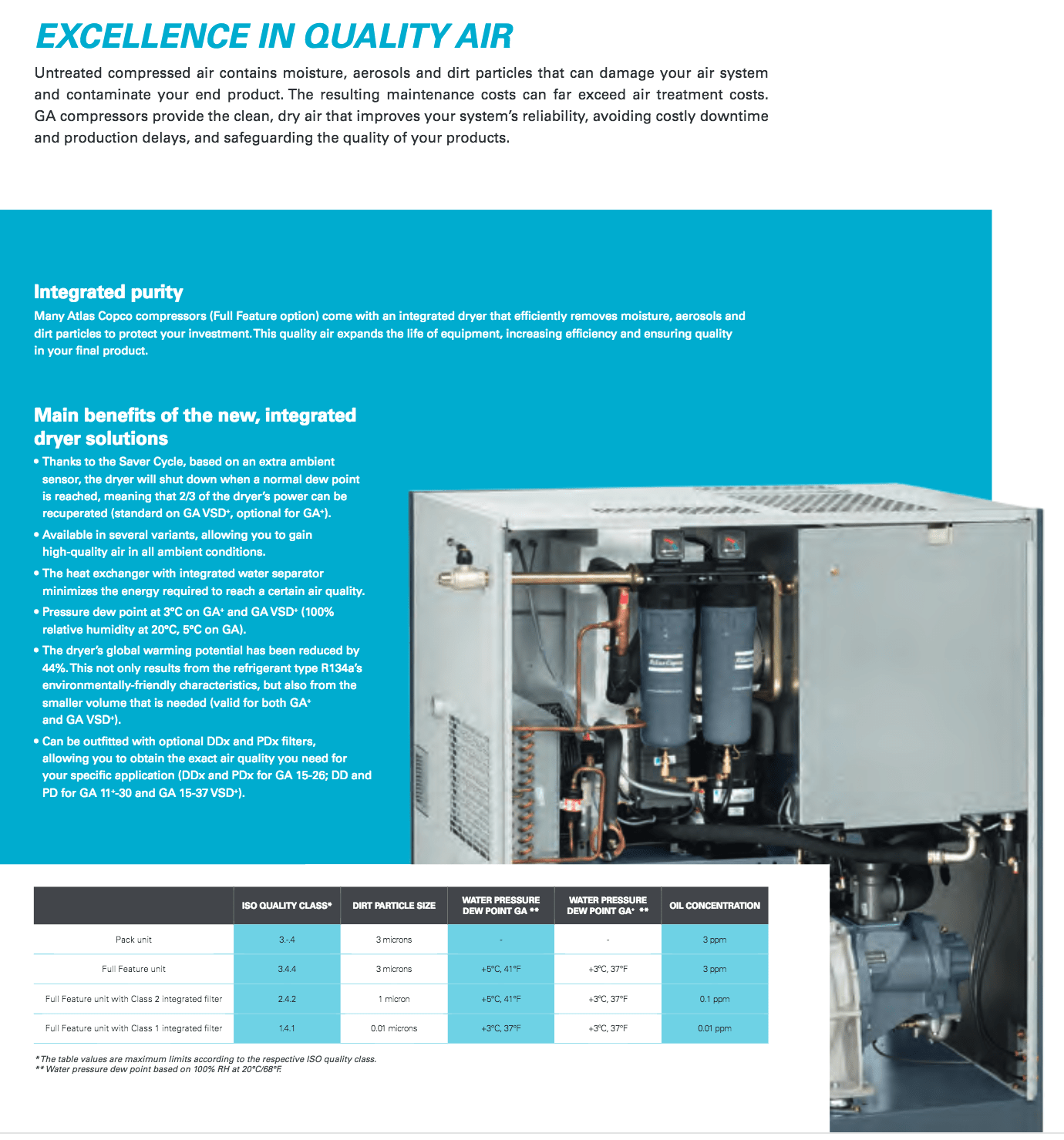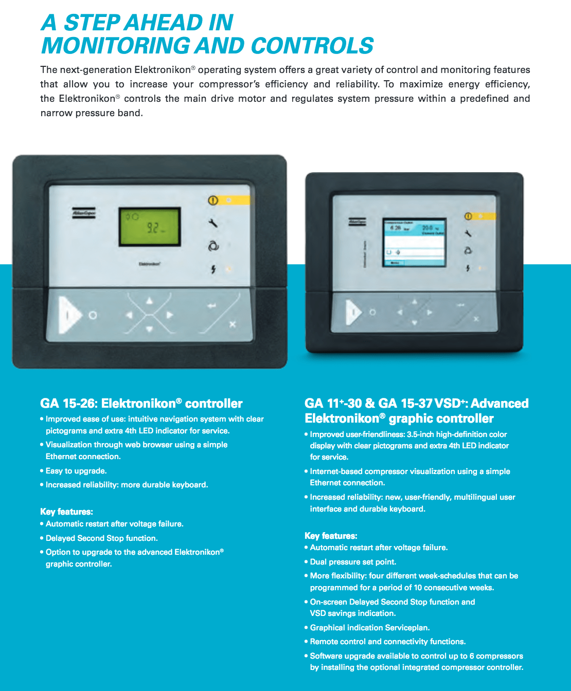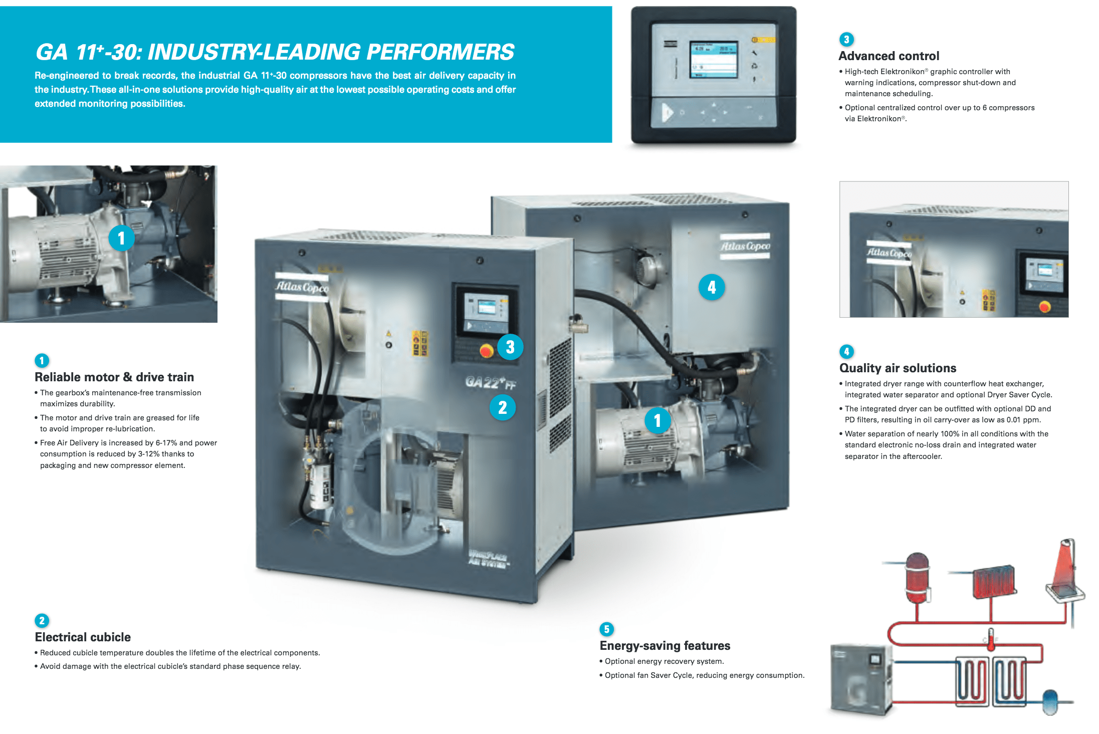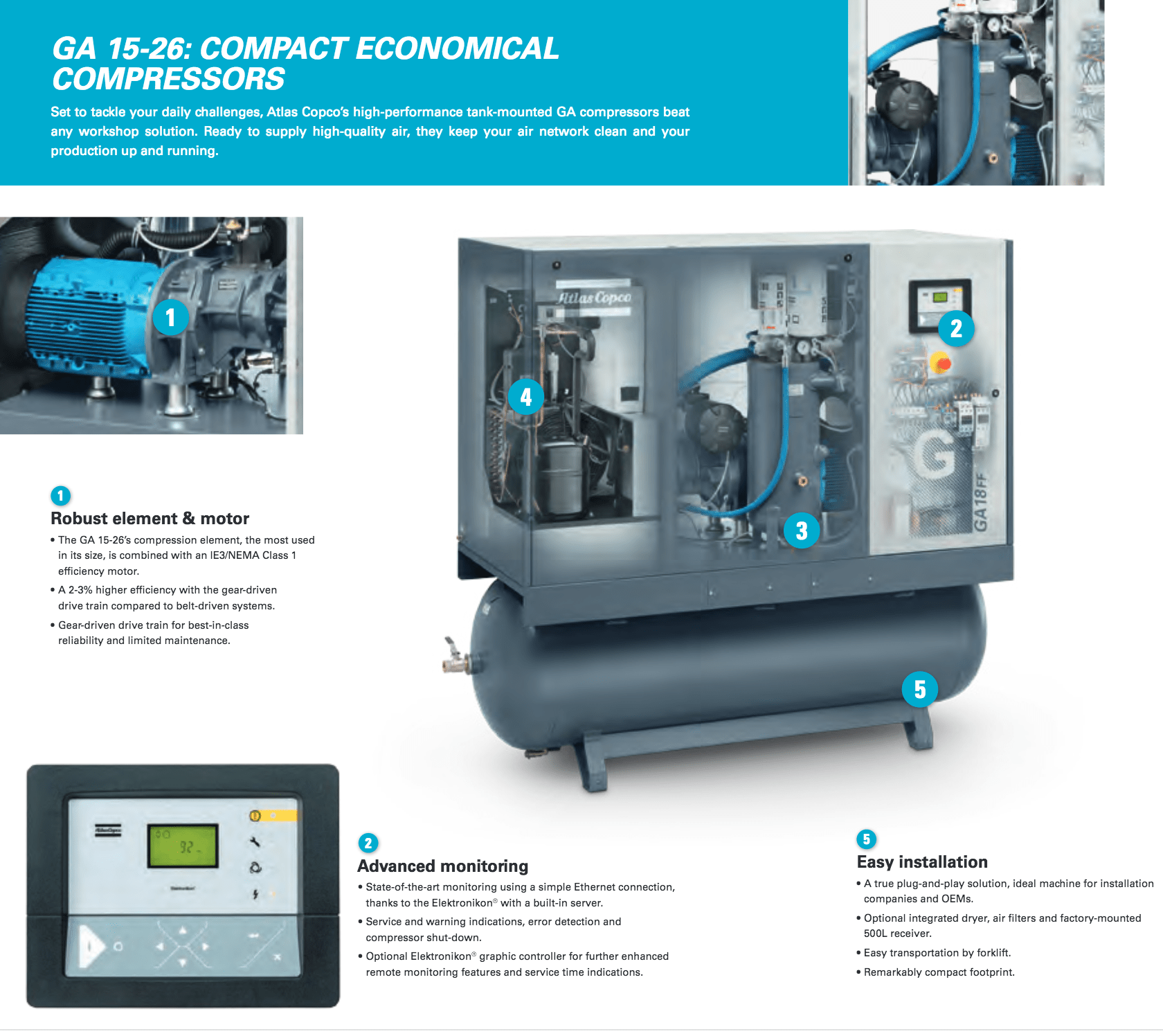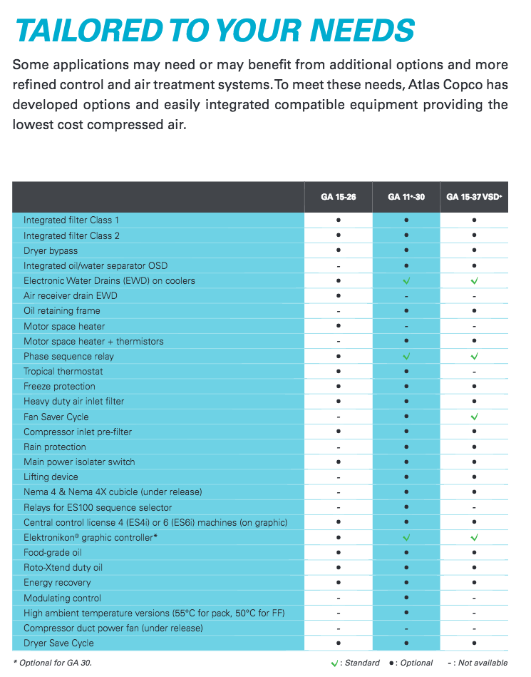 Atlas Copco GA Series 15-26- Single Stage, air-cooled and oil injected compressors. GA Series carries 20, 25, 30 & 35 Horsepower models which include drive motor, air and oil systems, Mark 5 Graphic and electrical regulating controls. These units are available to serve your needs in either a Pack or Full Feature.  Â