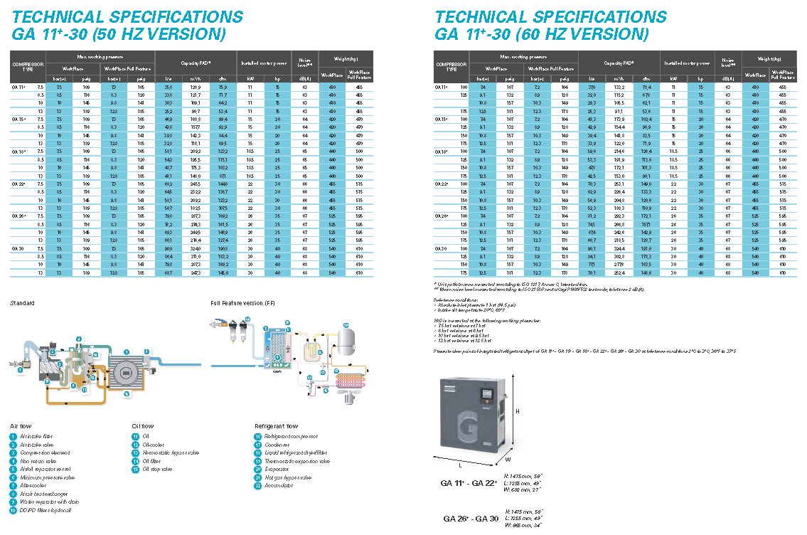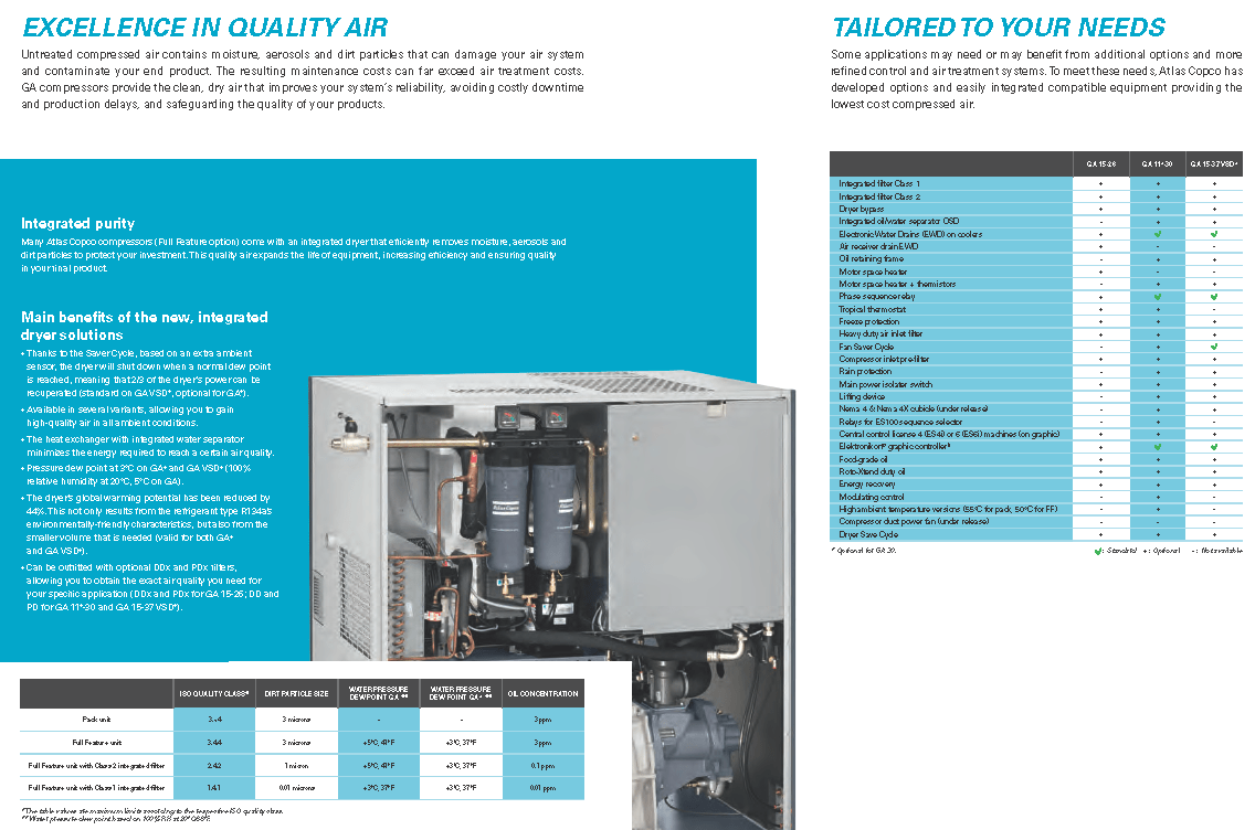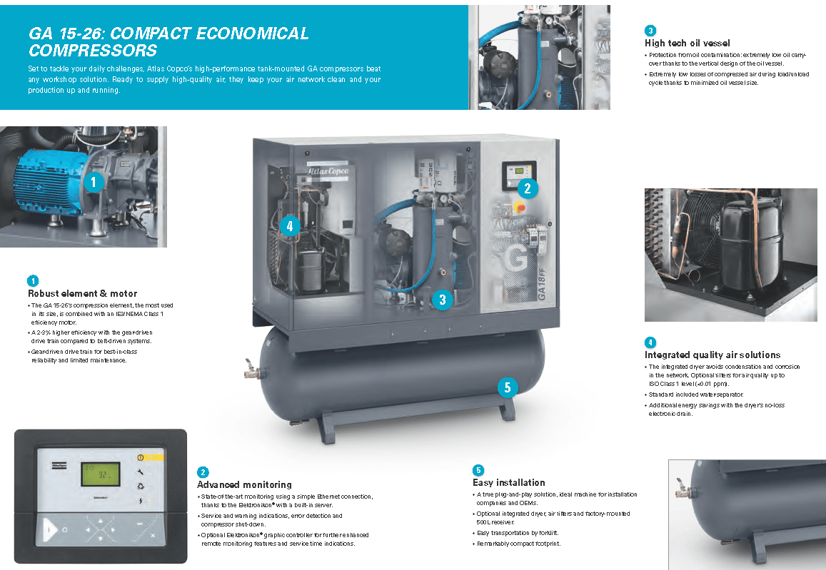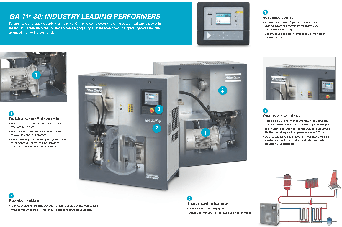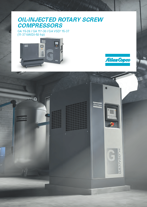 Atlas Copco GA Series 15-26- Single Stage, air-cooled and oil injected compressors. GA Series carries 20, 25, 30 & 35 Horsepower models which include drive motor, air and oil systems, Mark 5 Graphic and electrical regulating controls. These units are available to serve your needs in either a Pack or Full Feature option.