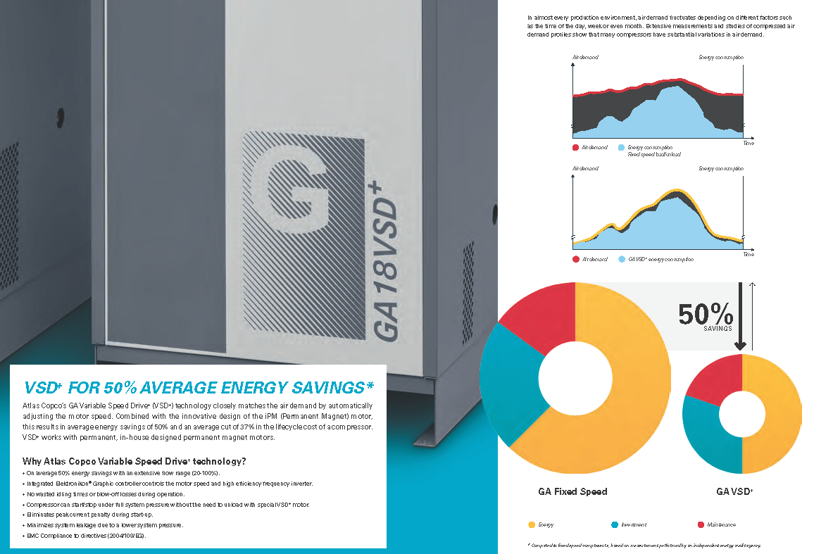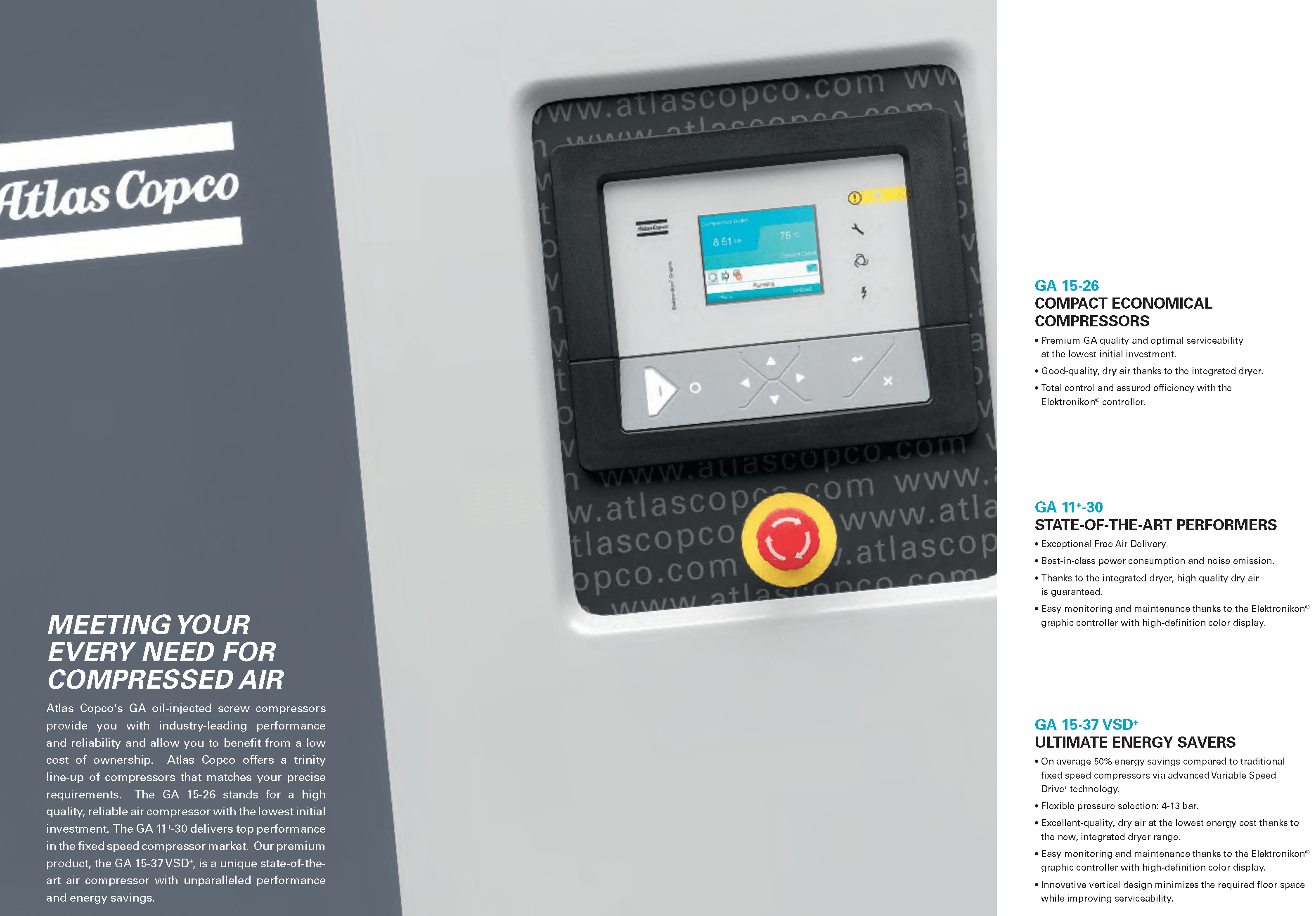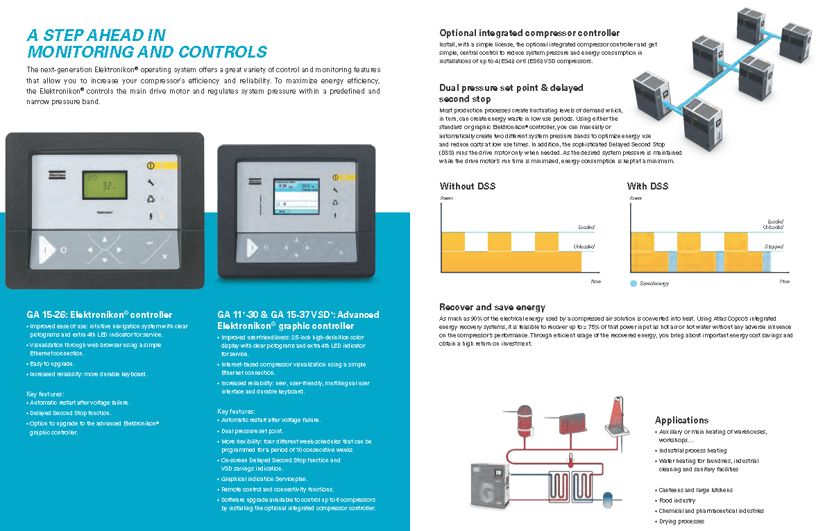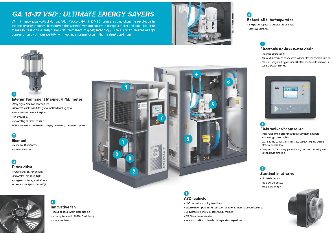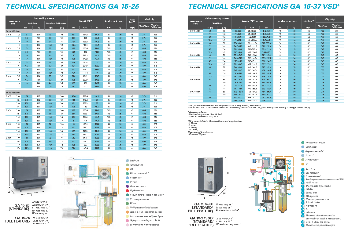 Atlas Copco GA Series 15-26- Single Stage, air-cooled and oil injected compressors. GA Series carries 20, 25, 30 & 35 Horsepower models which include drive motor, air and oil systems, Mark 5 Graphic and electrical regulating controls. These units are available to serve your needs in either a Pack or Full Feature option.
