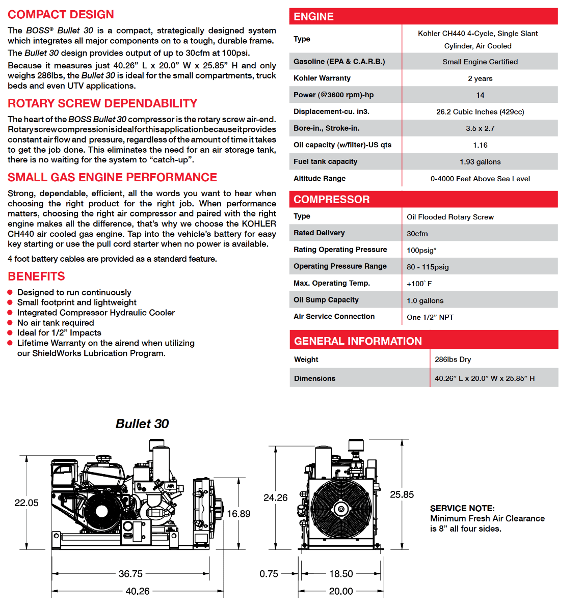 The Boss Bullet offers a high caliber performance from a high caliber machine. The Bullet is a fully self-contained, gas engine driven rotary screw air compressor. It's capable of producing 30 CFM and 100 PSI continuously, with plenty of reserve.