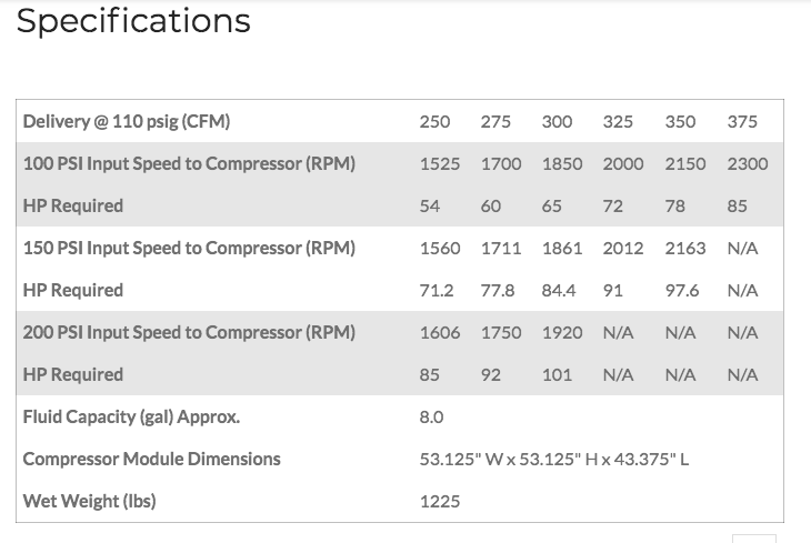 The BOSS INFINITY 375 (p/n 10131-001) advanced design allows you the option to choose any CFM output from 250 to 375cfm. By simply adjusting hydraulic flow to the compressor, the system will produce up to 375cfm at 110psig continuously.