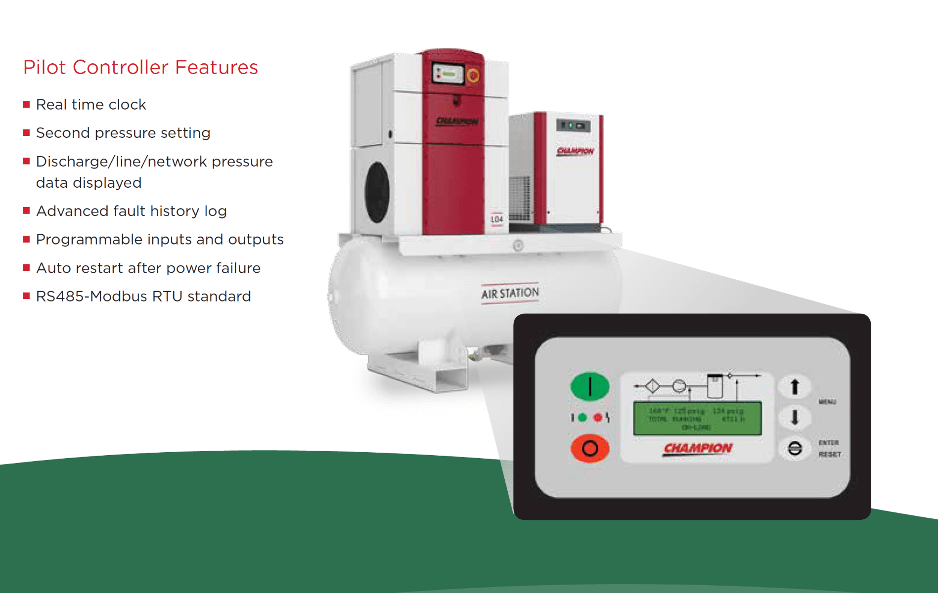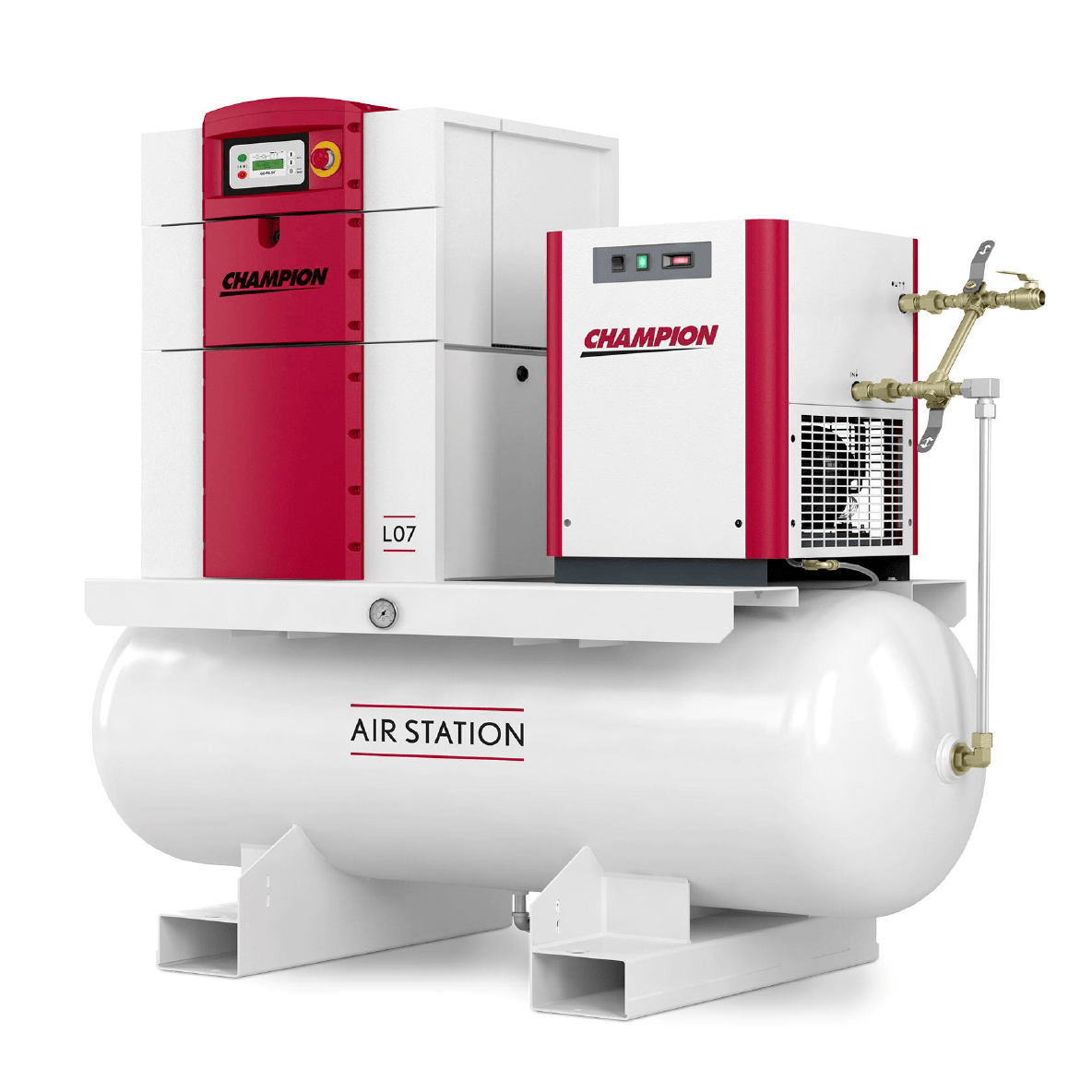 Champion's L-Series AirStation includes a Pre-Piped & Mounted Refrigerated Air Dryer, Mounted on a ASME Coded Air Tank.Â