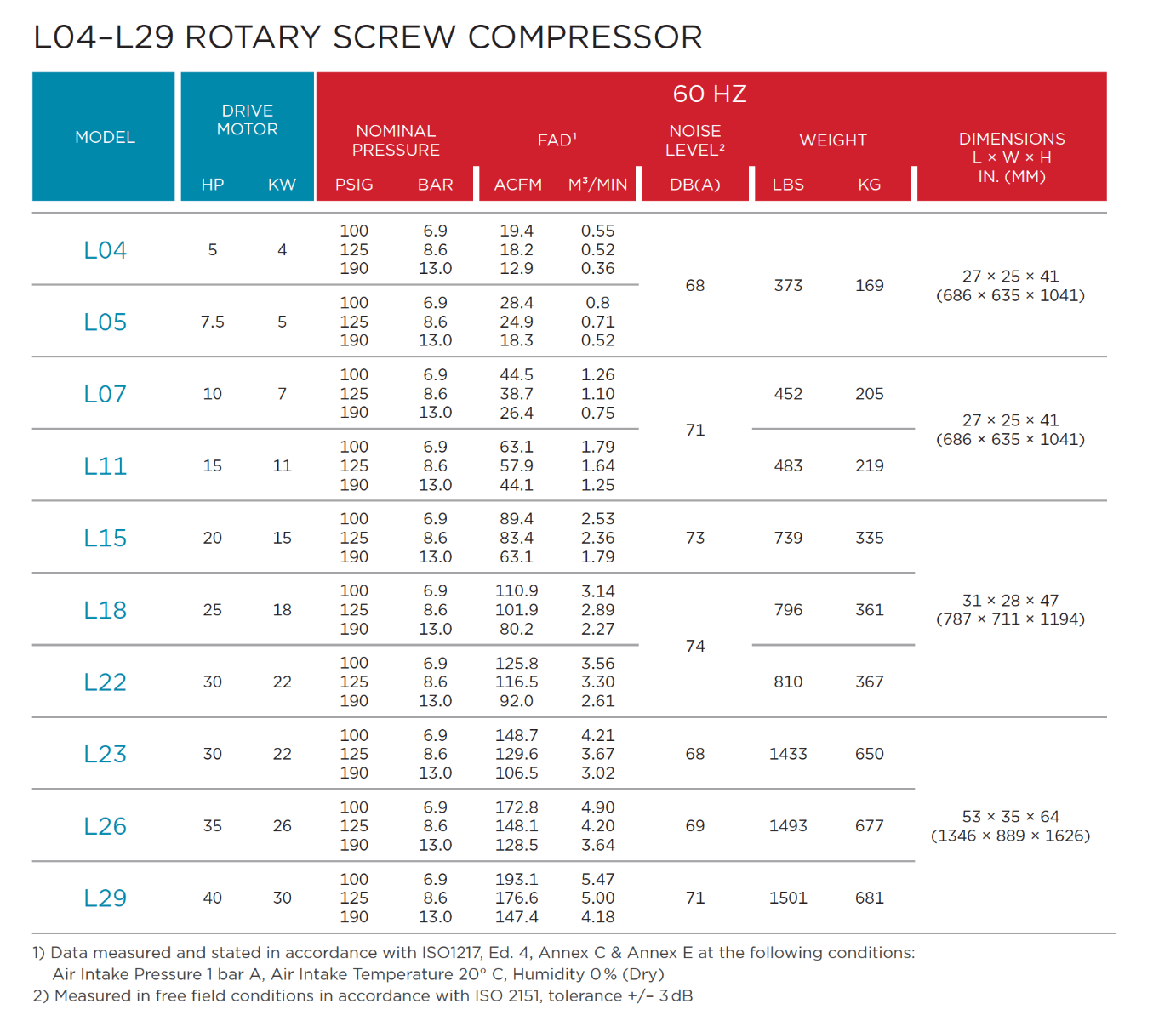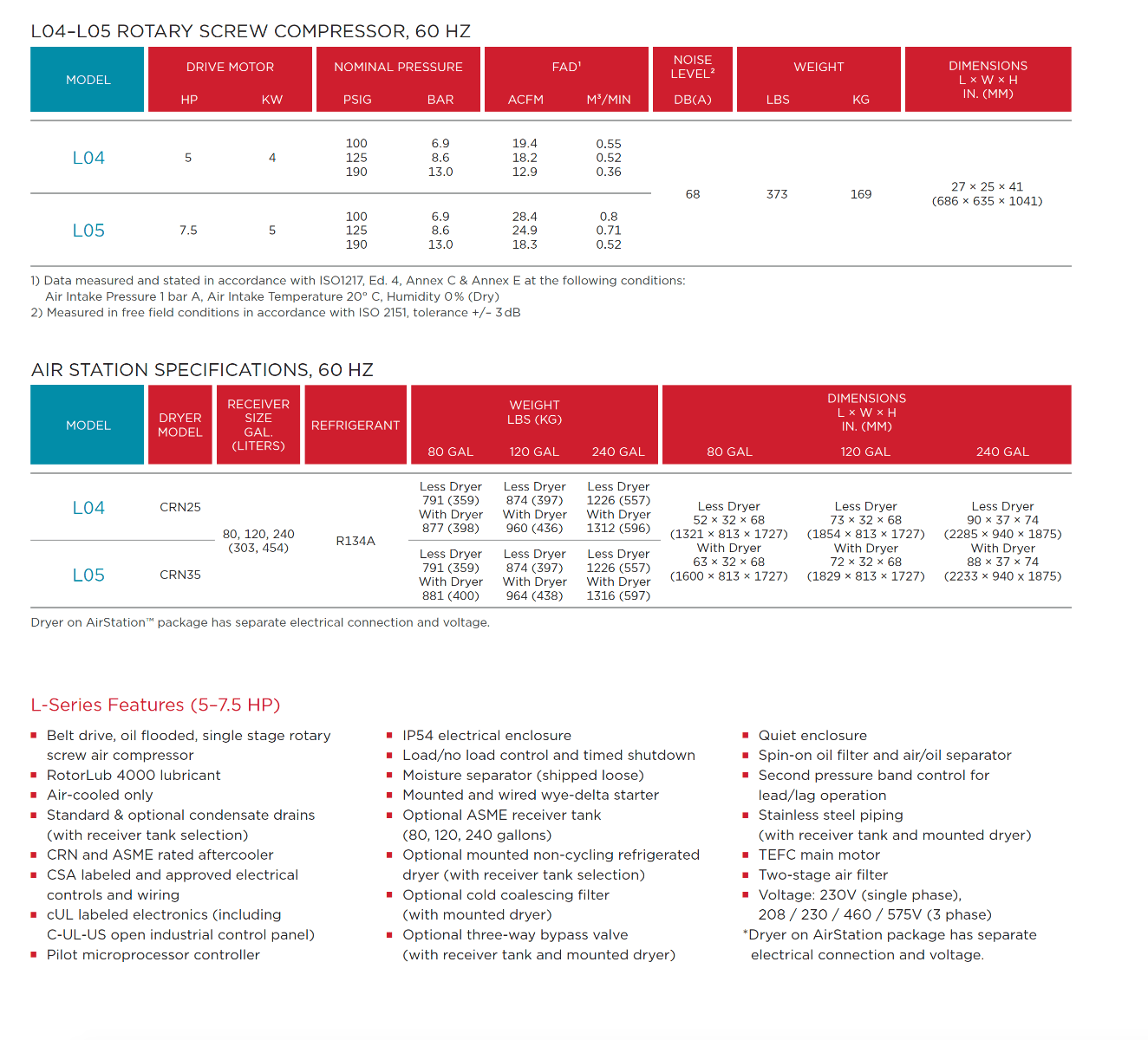 L-Series compressors are available in base mount or AirStationâ„¢ configurations. The plug-and-play AirStationâ„¢ configuration is an L-Series compressor mounted on a horizontal receiver tank with or without a refrigerated air dryer. Featuring high-end components such as the robust refrigerated dryer, stainless steel piping, integrated fork lift slots, the L-Series AirStationâ„¢ is the ideal solution for a compressed air system that requires minimal installation time and cost.
