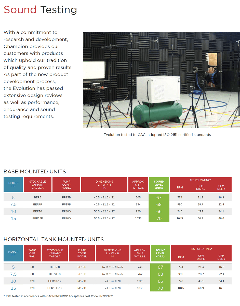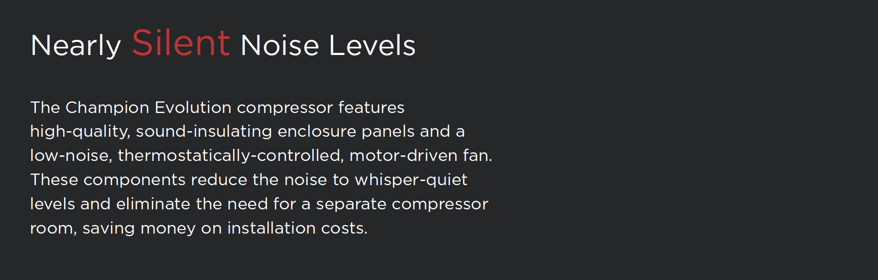The Champion Evolution provides the advantages of a reciprocating compressor coupled with the low noise of a rotary screw. Ideal for areas with a low noise requirement, Evolution can be installed directly within the work environment close to the point-of-use, which eliminates the need for a dedicated