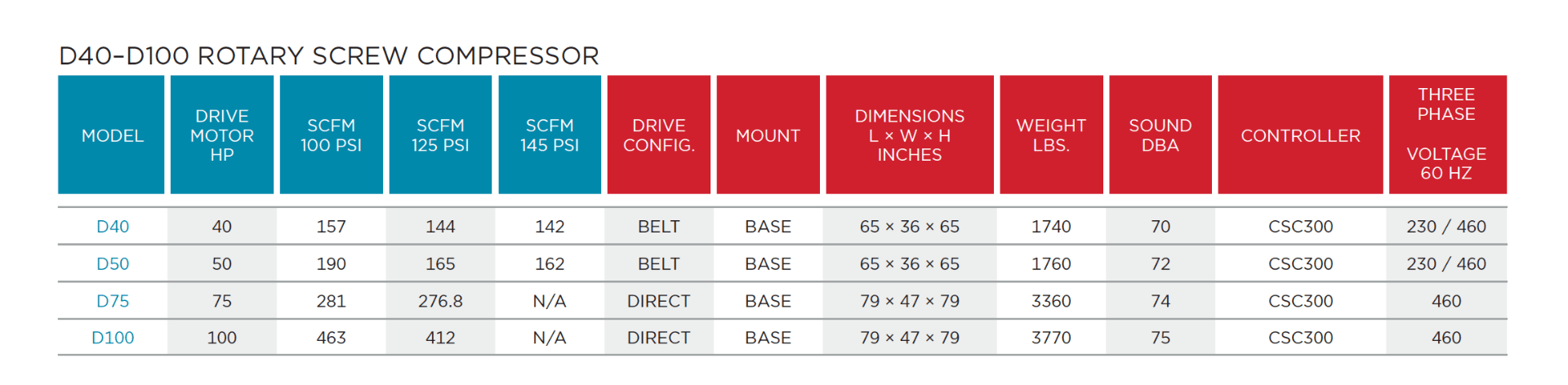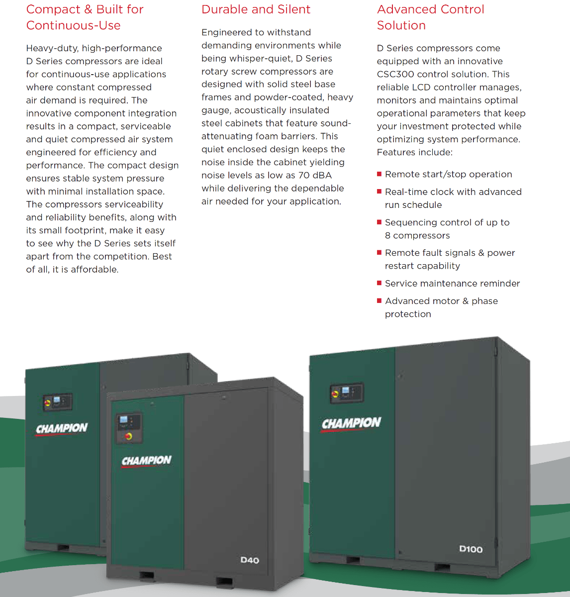 D Series compressor’s reliability and serviceability benefits, along with a small footprint, make it easy to see why the D Series sets itself apart from the competition. The D Series compressors are designed to operate at a 100% duty cycle and are ideal for demanding environments where continuous-use applications require dry, clean compressed air. The whisper-quiet, enclosed design ensures you can place the unit near the point-of-use without worrying about elevated noise levels. This allows you to work comfortably 24/7. Best of all, its affordable.