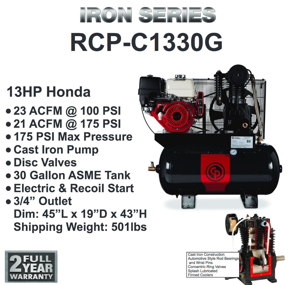 Chicago Pneumatic’s Iron Series features all cast iron design pumps.  The RCP-C compressors come with a full 2 Year Warranty (including valves).