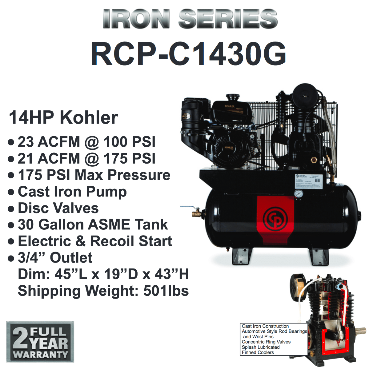 Chicago Pneumatic’s Iron Series features all cast iron design pumps.  The RCP-C compressors come with a full 2 Year Warranty (including valves).