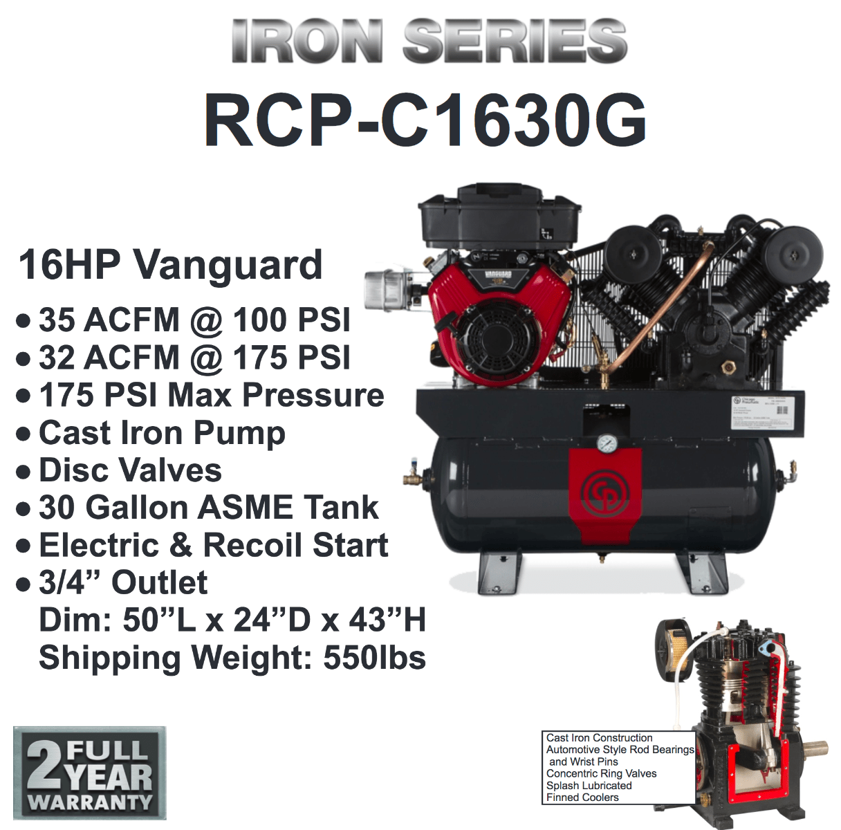 Chicago Pneumatic’s Iron Series features all cast iron design pumps.  The RCP-C compressors come with a full 2 Year Warranty (including valves).