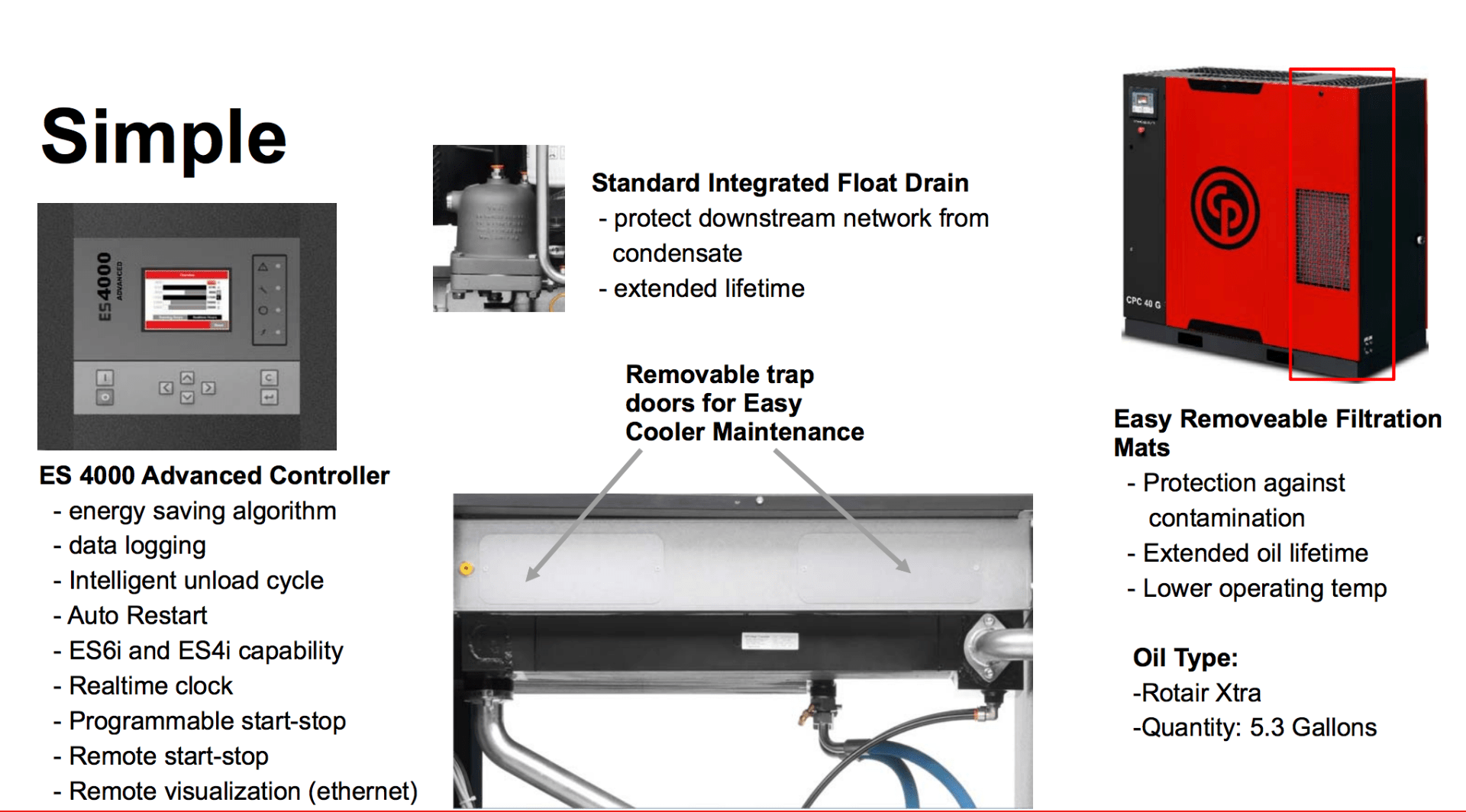 The CPCG Series are managed by the ES4000, an electronic control unit programmed for energy saving operation with intelligent shutdown. The ES4000 control can be programmed to shut down in accordance with your plant air demand and reduce long periods of unloaded operation, reducing power cost. The ES4000 control feature can save a customer hundreds of dollars per year.