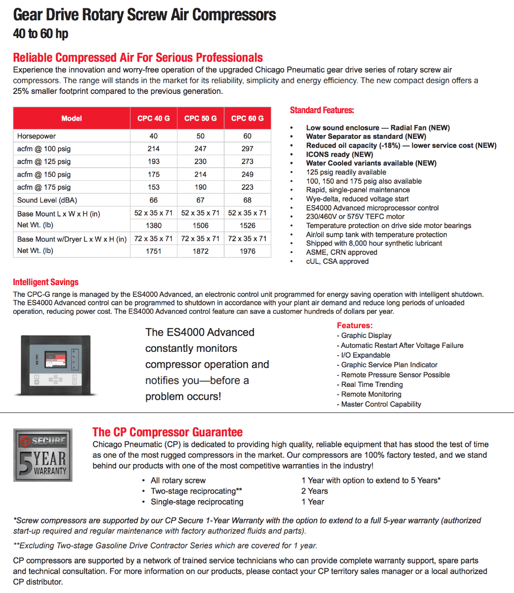 Chicago Pneumatic gear drive series of rotary screw air compressors offer innovation and worry-free operation. Pre-filtered air intake and reduced voltage starting mean low operating and maintenance costs. Standard enclosure and ease of maintenance produce an environment that lets you focus on your business, not your compressor!