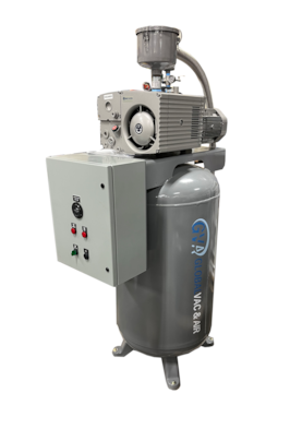 The GlobalVAC lubricated rotary vane vacuum pump tank mount vacuum systems are available in 1 to 10 hp  and mounted on a horizontal receiver. Systems are also available on a vertical receiver for 1 to 5hp. The system is built with isolation valve, check valve and rotary vane  vacuum pump mounted inlet filter assembly with quick clasp system for easy element changeout, The receiver is equipped with a sight glass and a manual drain valve. The System is operated by a mounted and wired Simplex Control Panel.