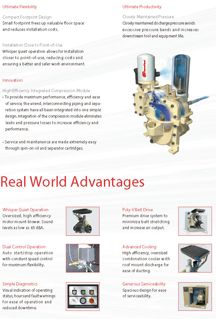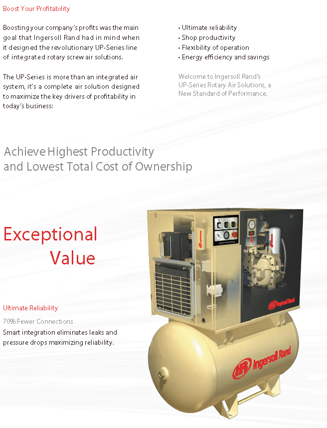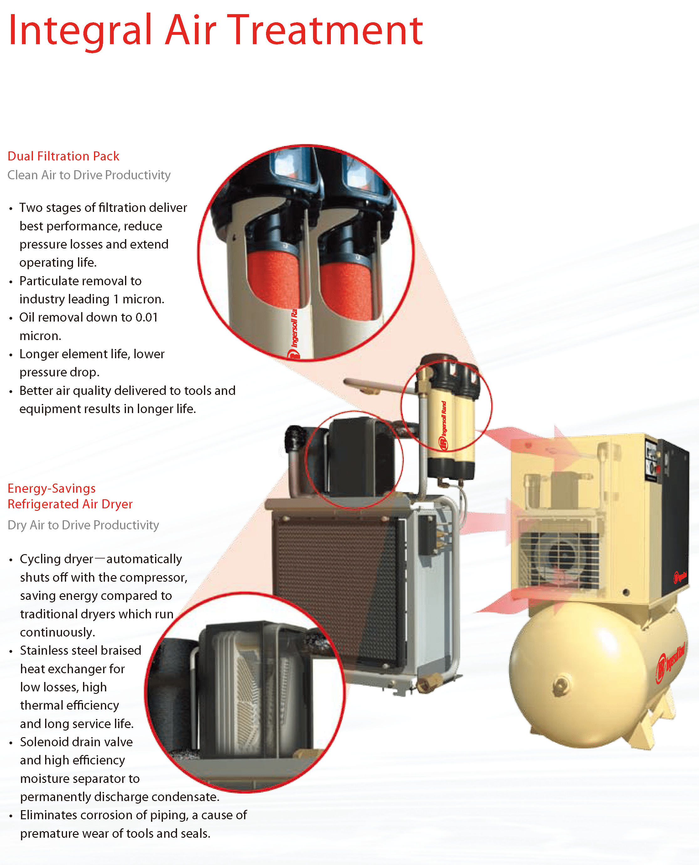 UP- Series 5-15 HP “Total Air System”—Looking to save space and installation costs? Consider the Small UP 5-15 HP “Total Air System” (TAS) packages as an innovative solution for your customer’s needs. TAS packages come standard with “Energy Star” cycling refrigerated air dryer with stainless steel heat exchanger, integrated compressor and dryer controls for optimum operation, panel mounted dew point indicator, dual filters (both pre and after) mounted and piped, single point condensate drain system with electric drain (115-volt), and high efficiency moisture separator.