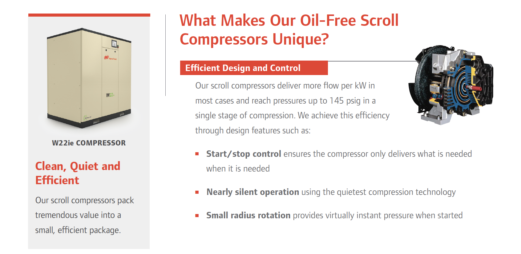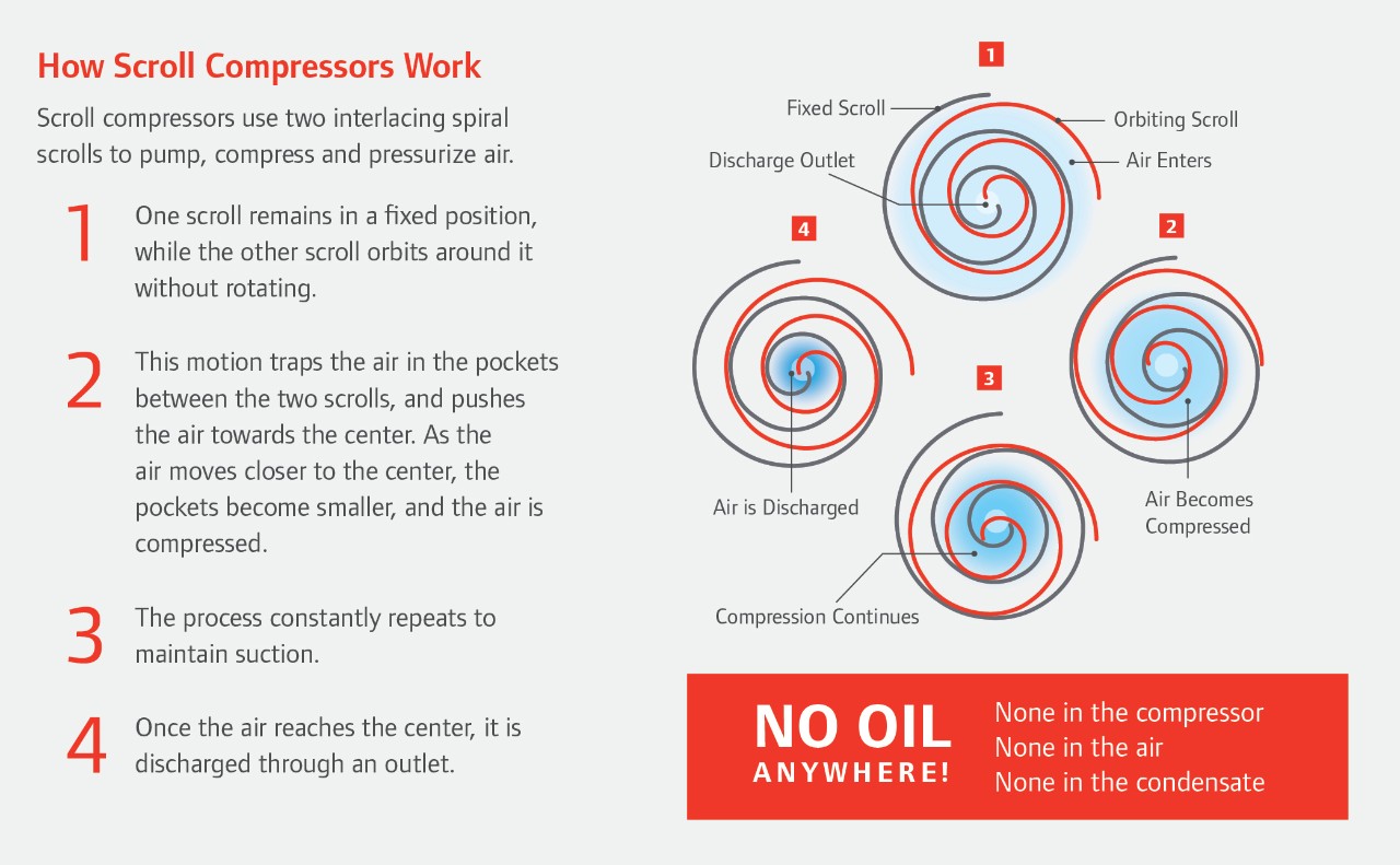 When efficiency, quiet operation, low maintenance and a small footprint are critical, Scroll Air Compressors are the smart choice. Their compact and innovative design make them ideal for many commercial applications where reliable oil-free air is required. Our Scroll Compressors deliver more flow per kW in most cases and reach pressures up to 145 psi in a single stage of compression with no metal to metal contact anywhere – therefore the technology requires no lubrication resulting in high quality oil-free air.