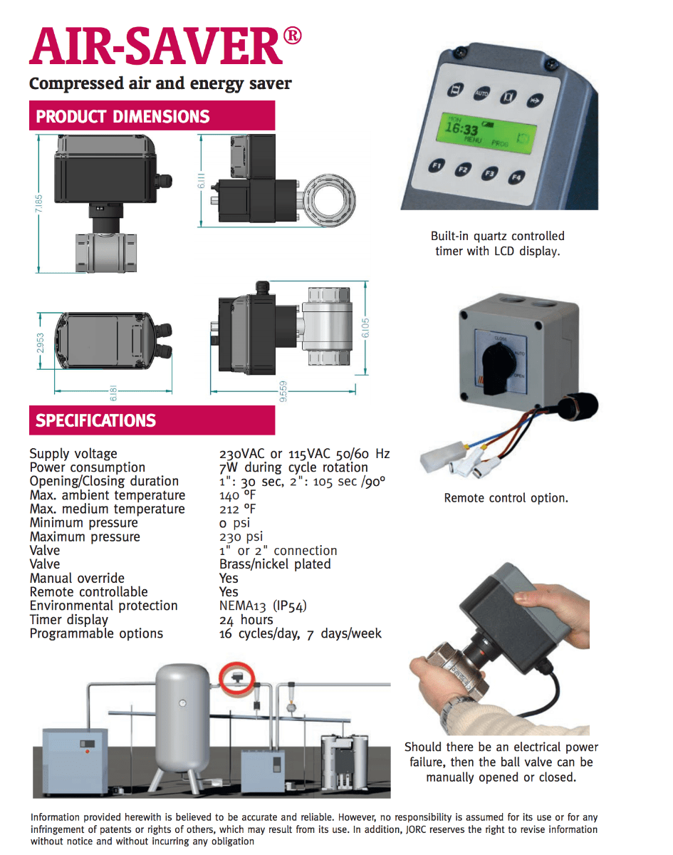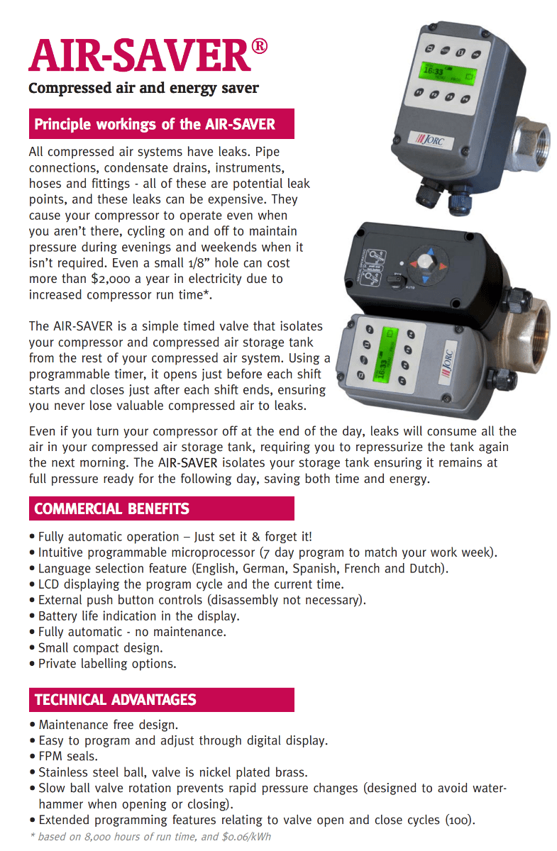 The AIR-SAVER is a simple timed valve that isolates your compressor and compressed air storage tank from the rest of your compressed air system. Using a programmable timer, it opens just before each shift starts and closes just after each shift ends, ensuring you never lose valuable compressed air to leaks.