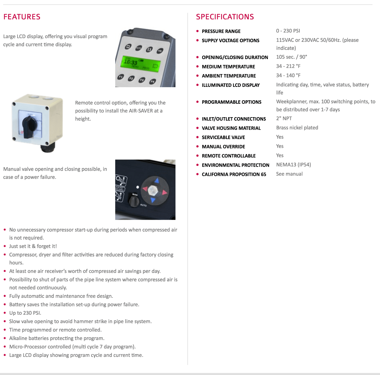 The AIR-SAVER is a simple timed valve that isolates your compressor and compressed air storage tank from the rest of your compressed air system. Using a programmable timer, it opens just before each shift starts and closes just after each shift ends, ensuring you never lose valuable compressed air to leaks.