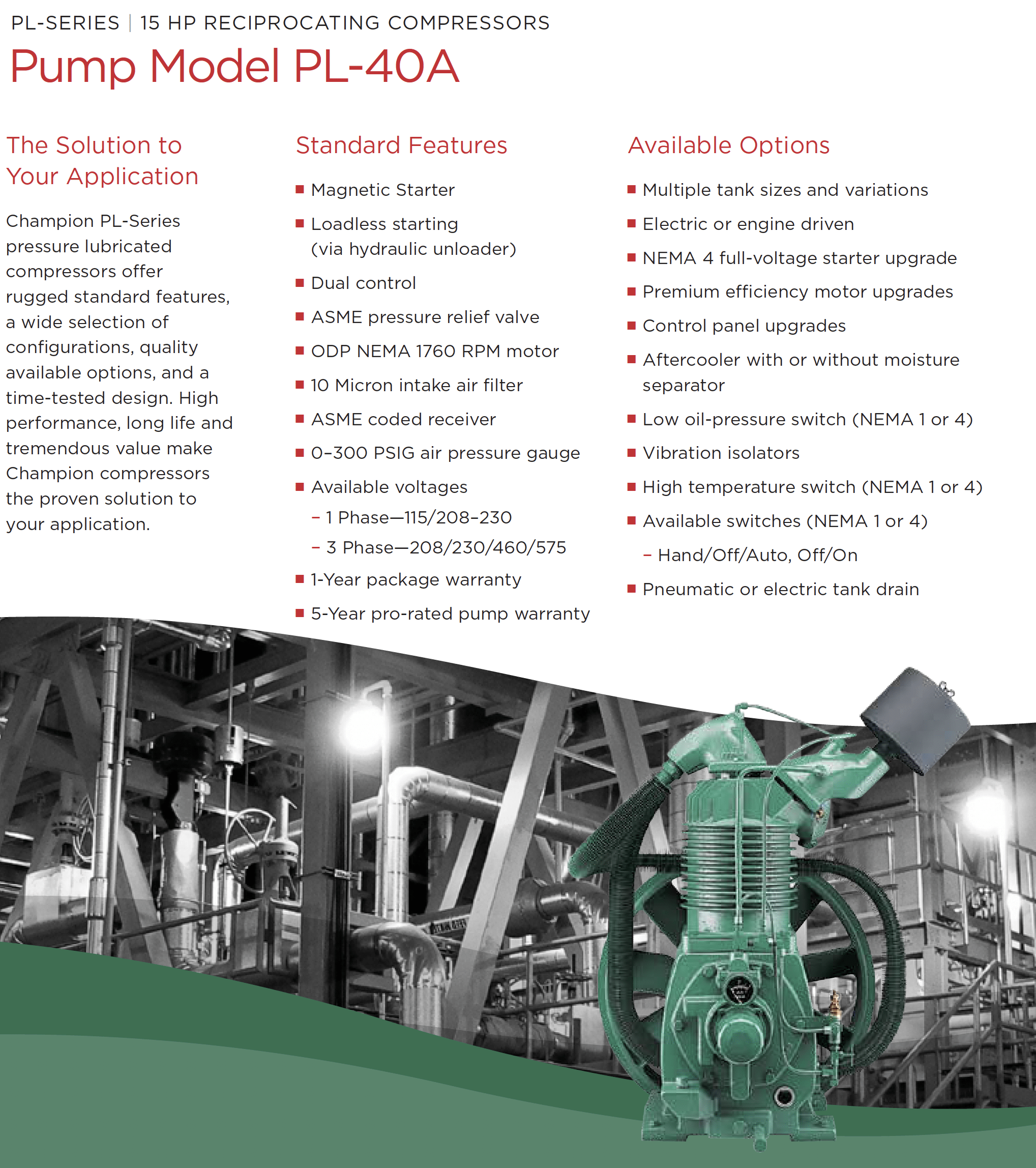 Champion PL-Series pressure lubricated compressors offer rugged standard features, a wide selection of configurations, quality available options, and a time-tested design. High performance, long life and tremendous value make Champion compressors the proven solution to your application.