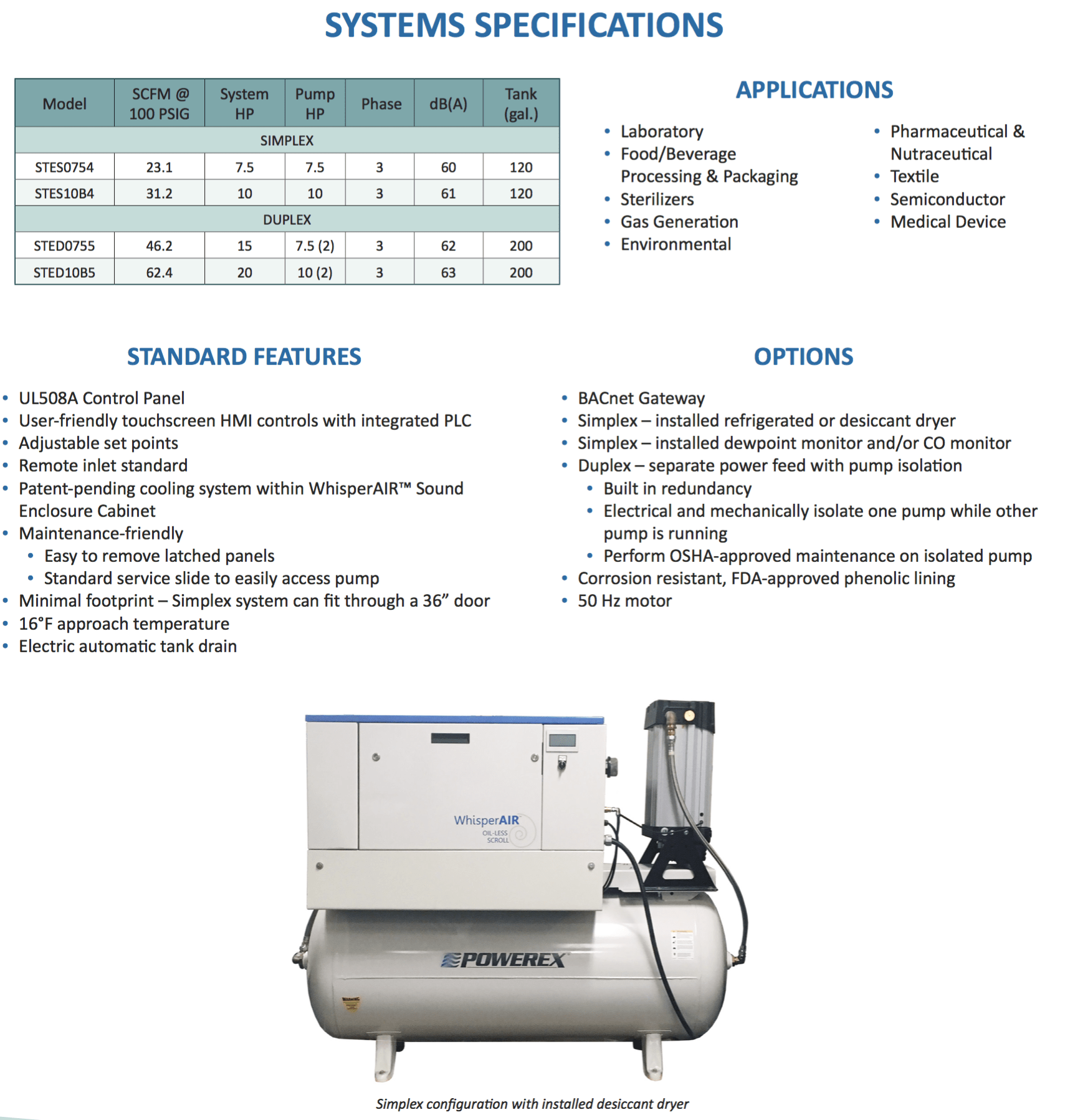 Powerex’s trademarked oil-free enclosure systems offer the lowest noise levels in the industry. Each system is packaged in a rigid steel frame with powder coated panels and lined with sound-deadening insulation. The low noise levels are unmatched in the industry and allow installation at the point of use, while the small footprint simultaneously maximizes floor space.