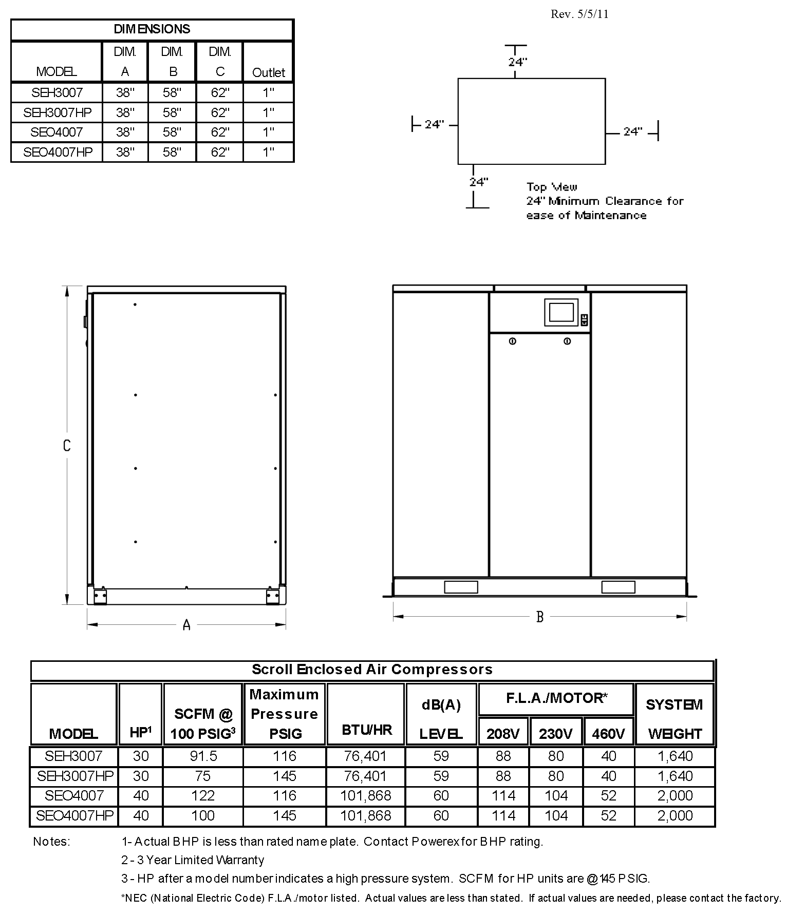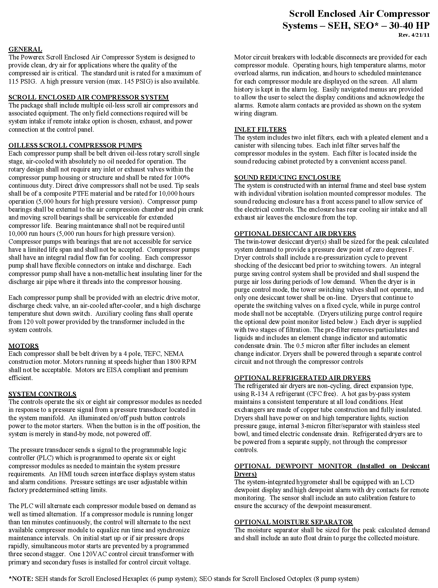 Powerex 30 HP Air Compressor Oilless Scroll 91.2 CFM, 100 PSI | 208 VOLT - 3 PHASE| SEH3007-2