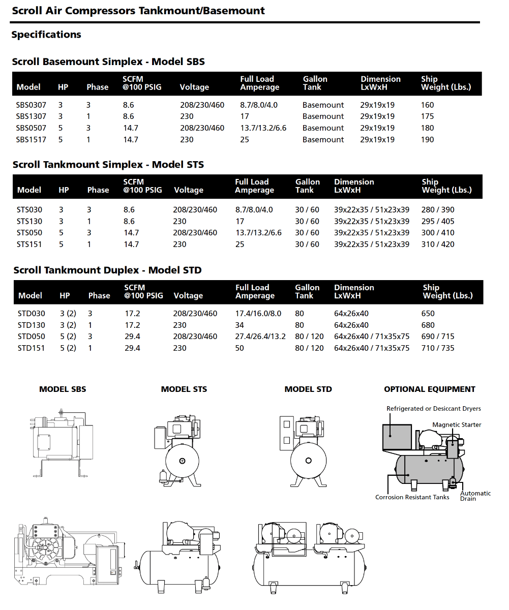 Our simplex and duplex scroll tank mounted systems with integral aftercooler design are perfect for any application where clean dry air is required. Starter control panel and dryer options are available to customize the system for a particular application.