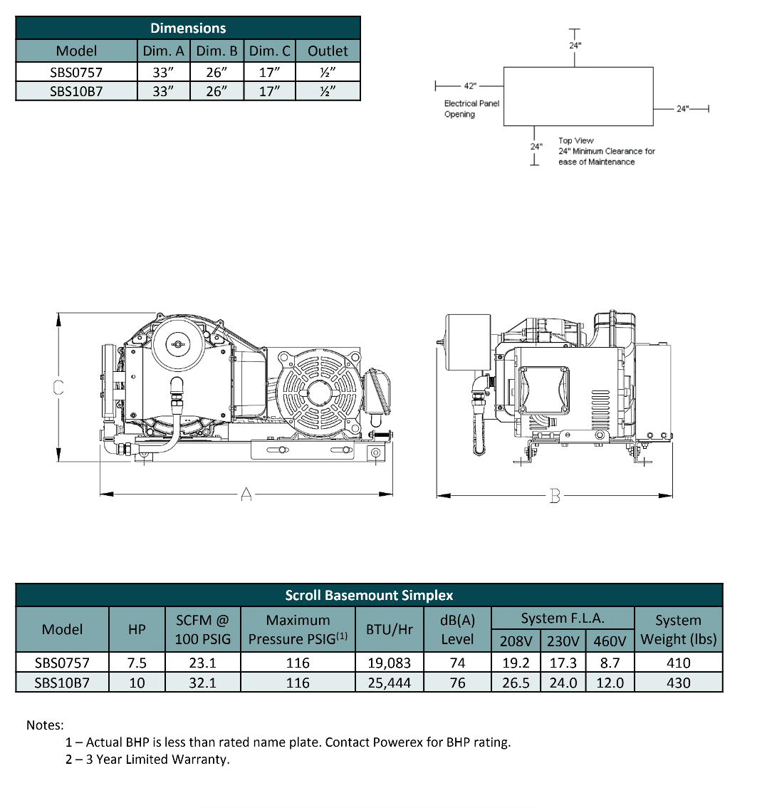 Powerex 7.5 HP Air Compressor Oilless Scroll 3-Phase, 23.1 SCFM 460 VOLT | SBS0757-40