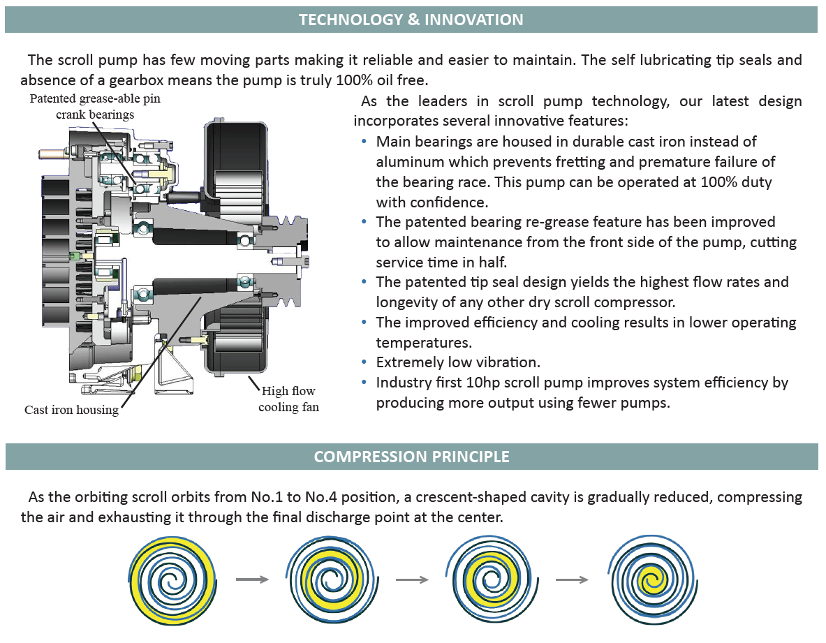 Each compressor shall be belt driven oil-less rotary scroll single stage, air-cooled, oil-less construction with absolutely no oil needed for operation. The rotary design shall not require any inlet or exhaust valves and shall be rated for 100% continuous duty. Tip seals shall be of a composite PTFE material and be rated for 8,000 hours operation. Compressor bearings shall be external to the air compression chamber and shall be able to be re-greased in the field for extended life. Patented re-grease ports shall be located on the front side of the pump allowing service without removing the pump drive pulley. Bearings shall have an MTBF life of no less than 33,000 hours. Compressors with bearings that are not accessible for service have a limited life span and shall not be accepted. Pump crankshaft and main bearing housing shall be constructed of heavy duty Cast Iron for maximum durability. Compressors shall have an integral radial flow fan for cooling and rated for 116 psig maximum pressure at sea level.