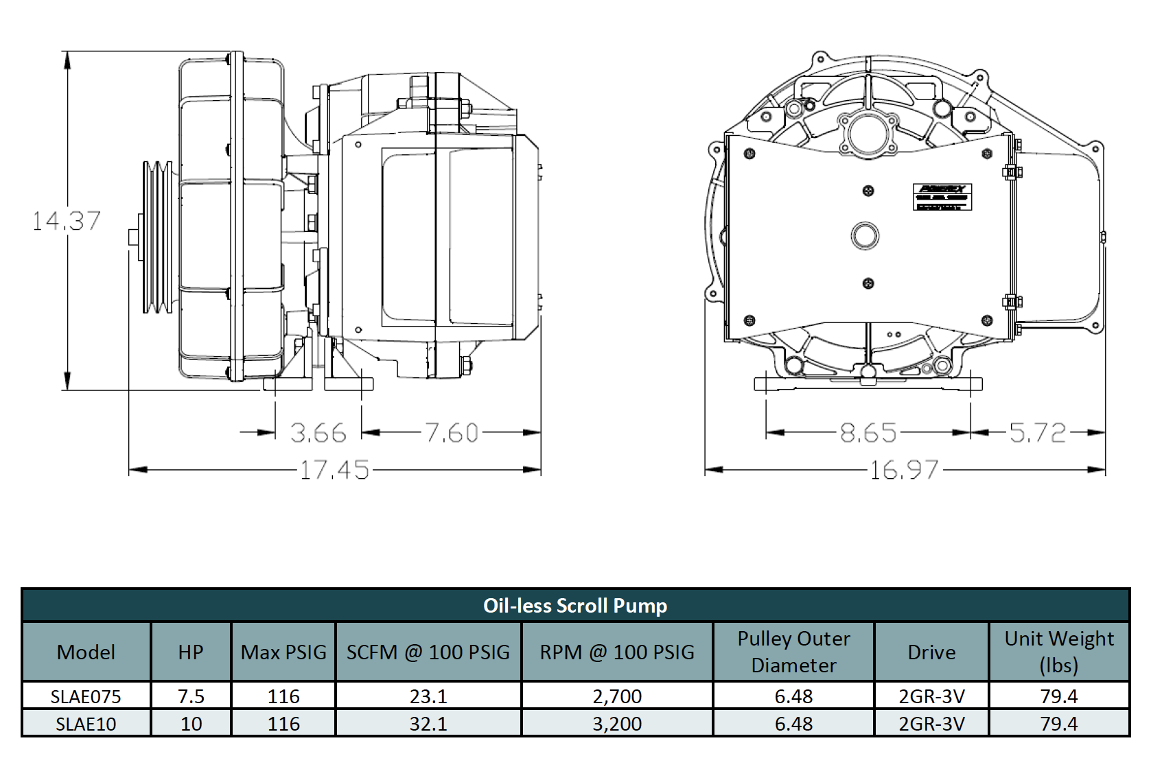 Powerex SLAE075HP, 7.5 HP Air Compressor Oilless Scroll Pump, 17 CFM @ 145 PSI, 100% Oil-Less