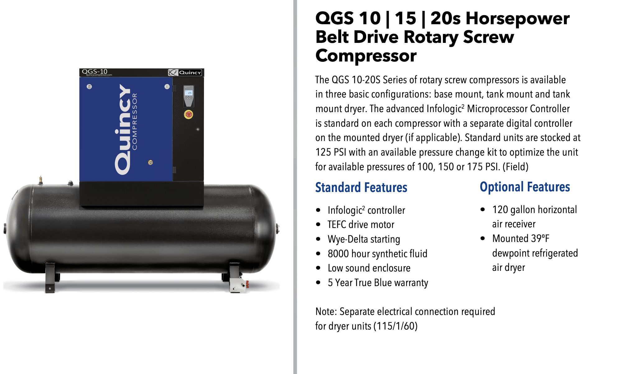 Quincy understands the critical nature of your compressed air system to maintain production. Quincy's QGS line of compressors help drive your profitability by lowering your total cost of ownership while providing you with the performance and reliability that you have come to expect from Quincy compressors. The QGS air compressor has many of the features, benefits, and advantages of larger compressed air systems in a package that fits your application and at a price you can afford.