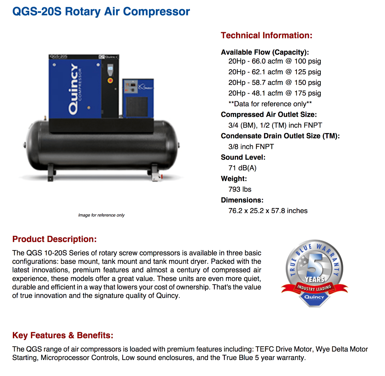 | Quincy understands the critical nature of your compressed air system to maintain production. Quincy's QGS line of compressors help drive your profitability by lowering your total cost of ownership while providing you with the performance and reliability that you have come to expect from Quincy compressors. The QGS air compressor has many of the features, benefits, and advantages of larger compressed air systems in a package that fits your application and at a price you can afford. |