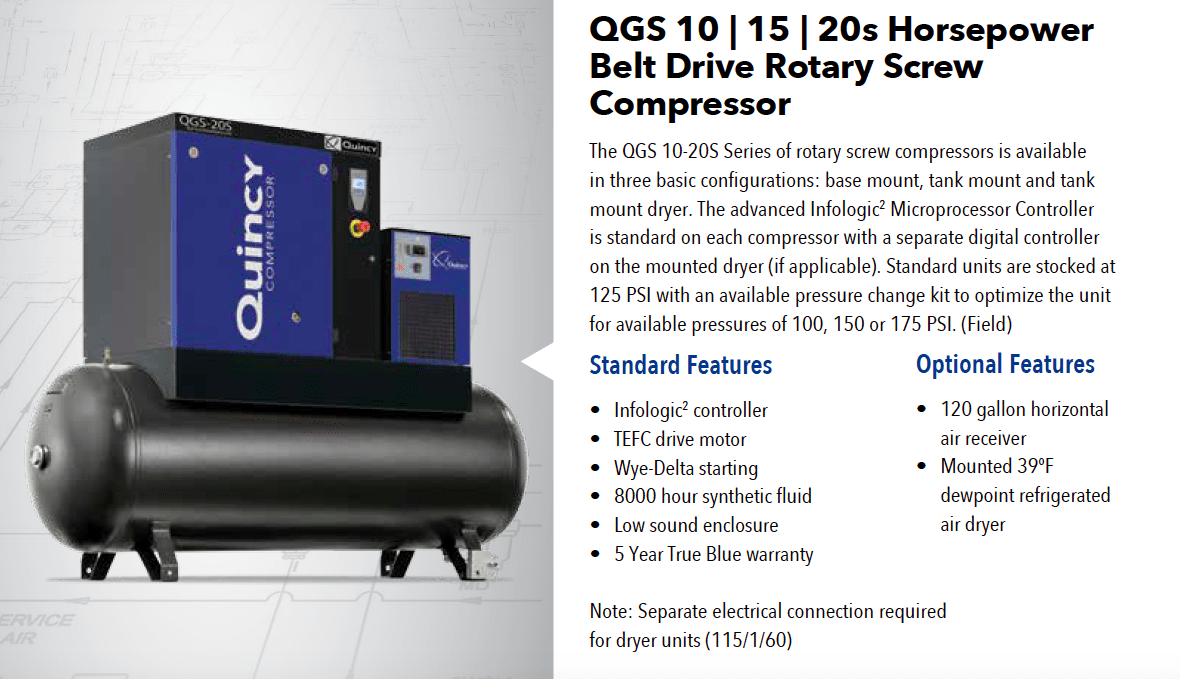 | Quincy understands the critical nature of your compressed air system to maintain production. Quincy's QGS line of compressors help drive your profitability by lowering your total cost of ownership while providing you with the performance and reliability that you have come to expect from Quincy compressors. The QGS air compressor has many of the features, benefits, and advantages of larger compressed air systems in a package that fits your application and at a price you can afford. |
