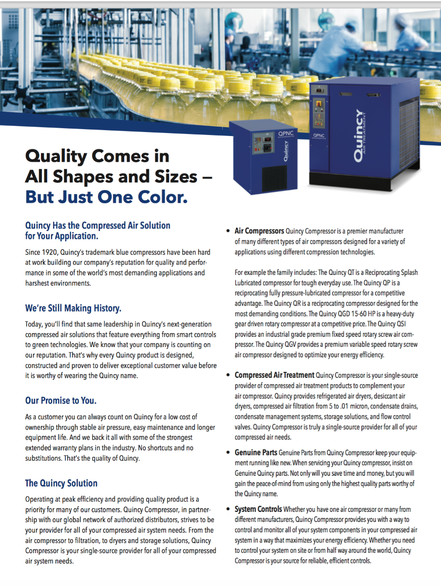 Quincy non-cycling dryers use a two-stage heat exchanger system to maintain consistent dew points. Temperature of the compressed air is reduced to approximately 39 degrees F to condense moisture. Moisture is then removed from the system by an integrated moisture separator and zero loss drain. The dry condensed air is then reheated by warm incoming air and is then ready for delivery to downstream products.