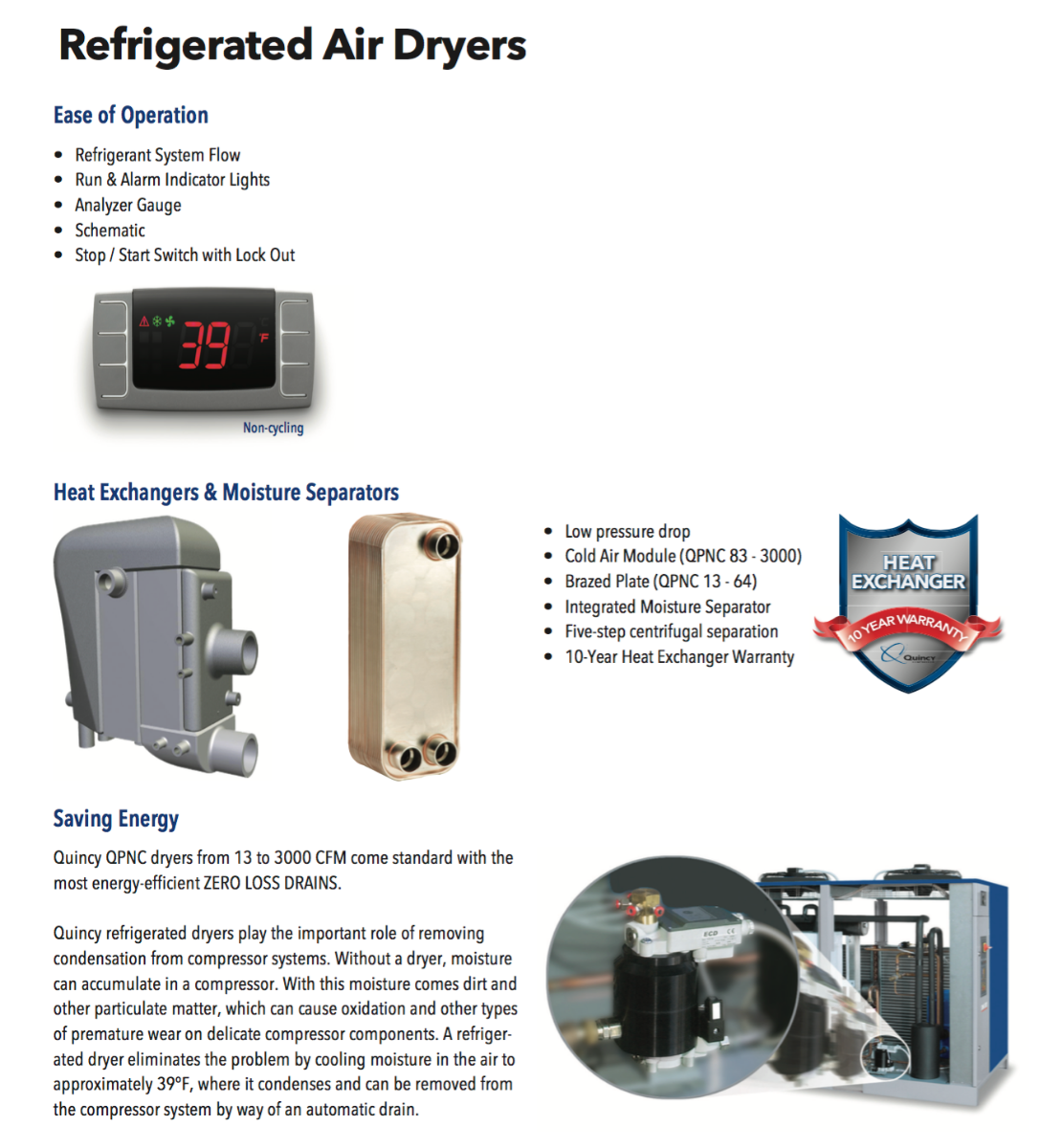 - Zero loss electronic drain for energy savings - Integrated moisture separator - Low pressure drop over dryer - 10-Year Heat Exchanger Warranty - Digital dew point display - Environmentally safe refrigerant