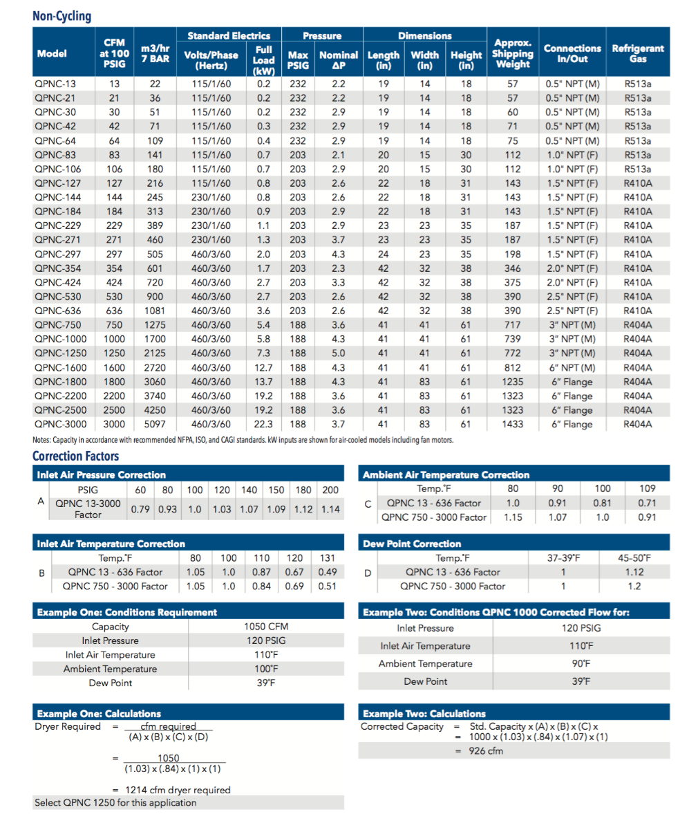 The QPNC is a high performance, conventional non cycling refrigerated air dryer with a simple control system that employs modulating refrigeration valves to maintain performance. Best suited for systems with relatively constant loads.