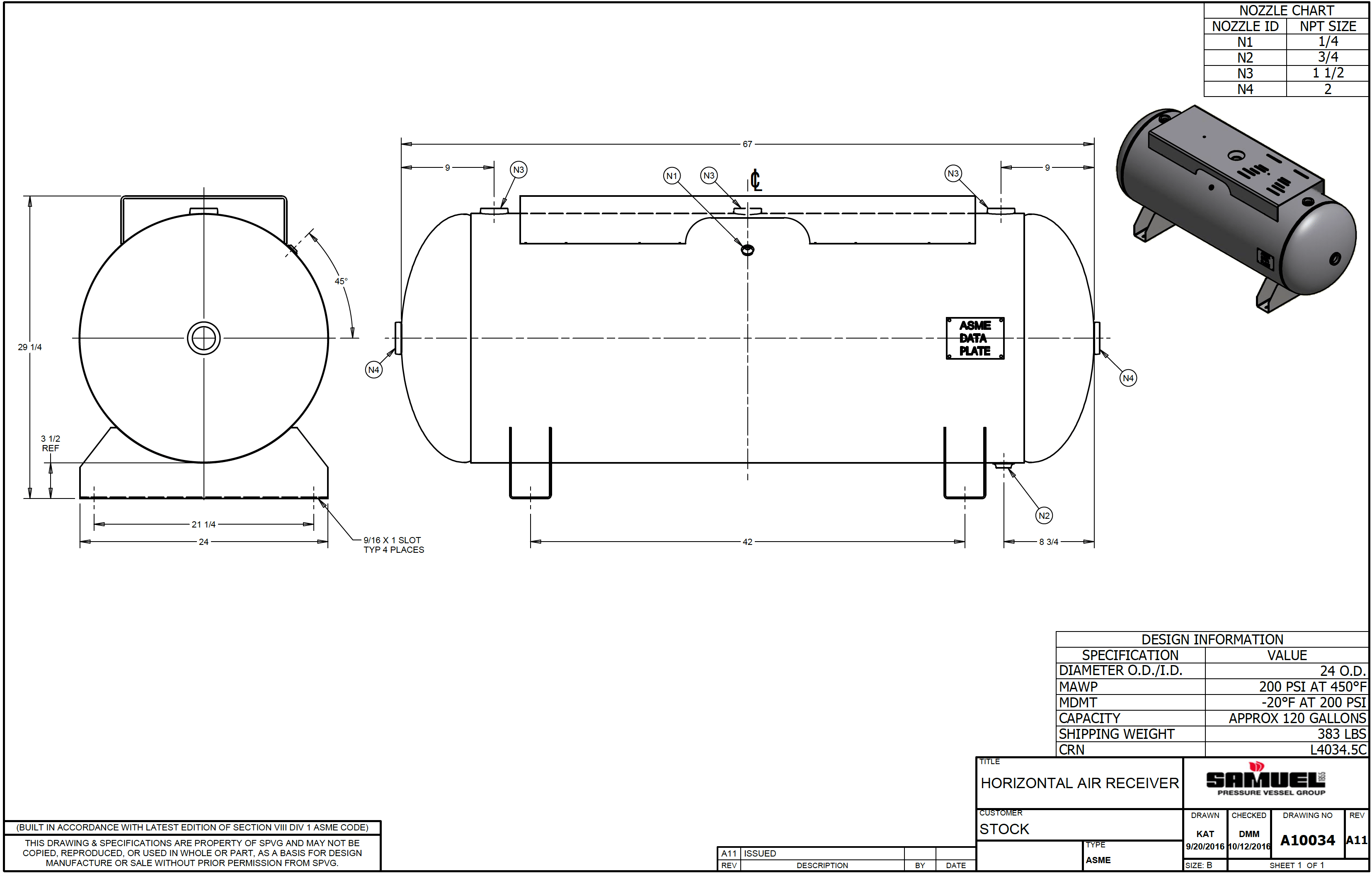 120 Gallon Horizontal Air Tank with Top Plate (18" x 44") Overall 24" x 67", 200 PSI ASME Coded | A10034