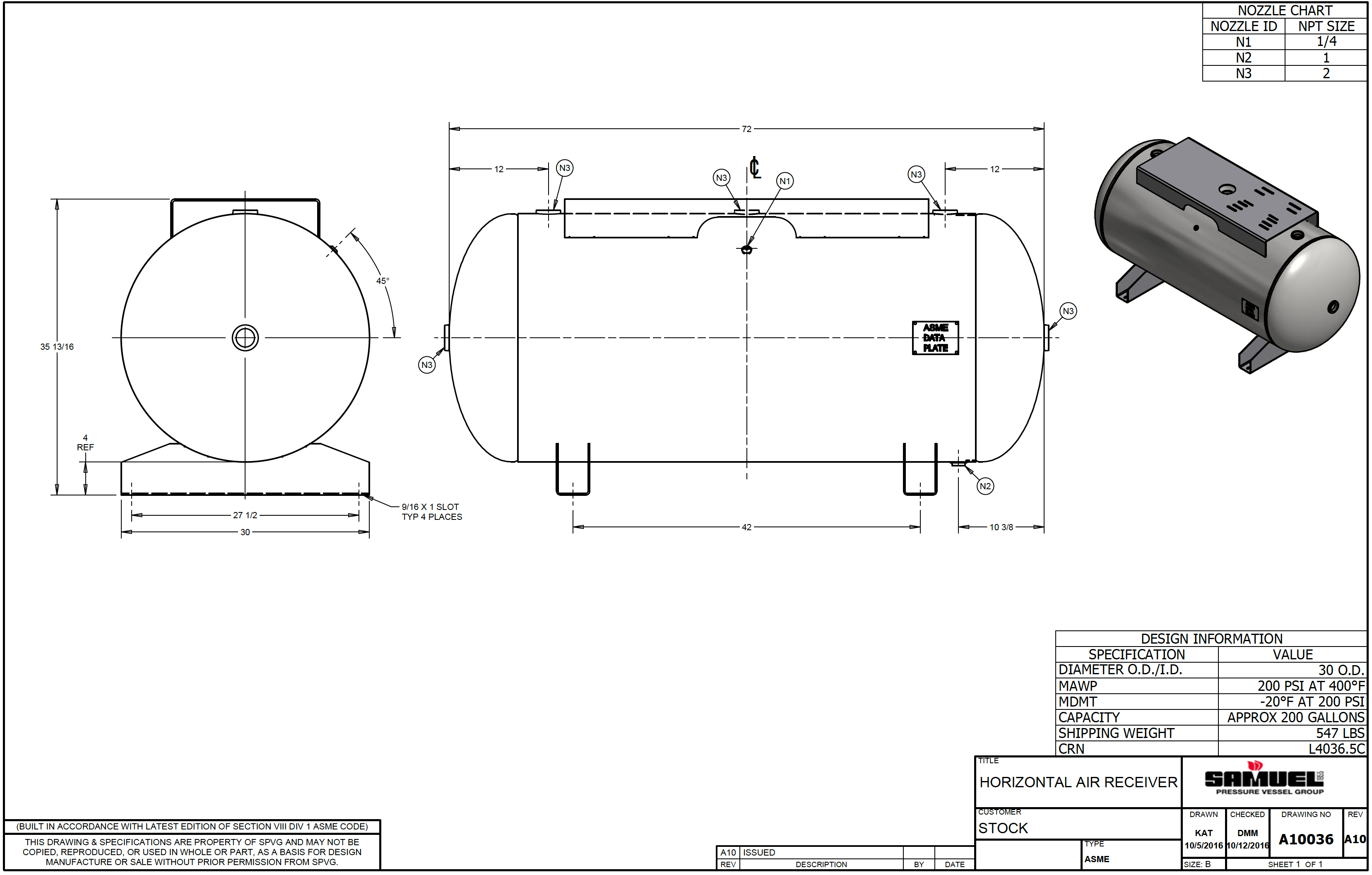 200 Gallon Horizontal Air Tank with Top Plate (18" x 44") Overall 30" x 72", 200 PSI, ASME Coded | A10036