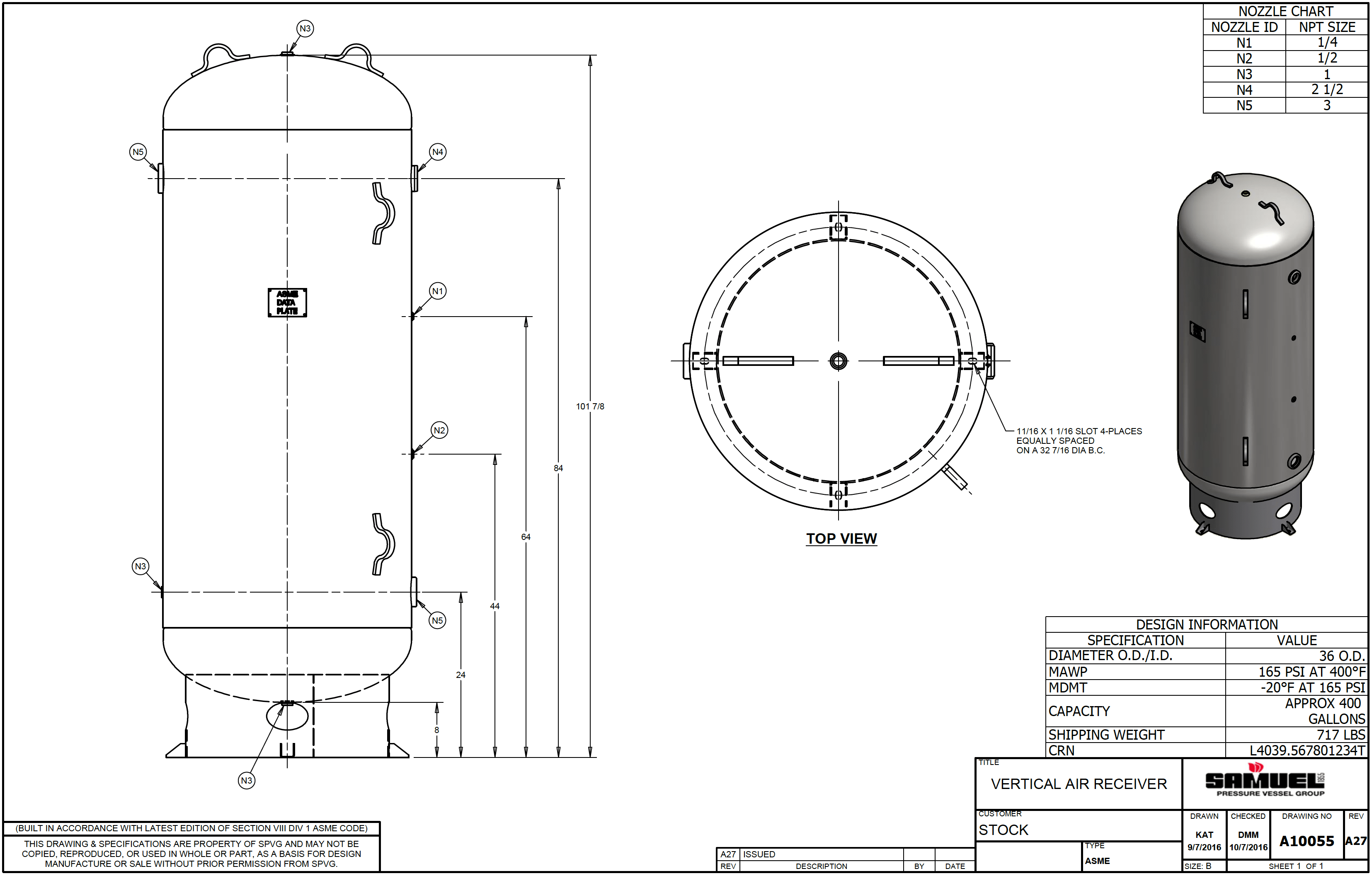 SteelFab 400 Gallon Vertical Air Tank, 36" x 93" with 8" Base Ring, Rated for 165 PSI, ASME | A10055